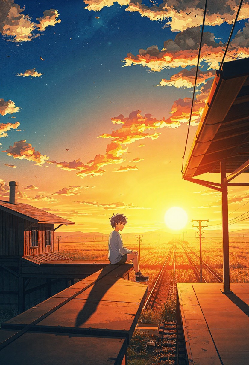 Vertical 9:16 cinematic anime scene, anime boy sitting quietly on the roof of a small rural train station, distant fields glowing under the setting sun, cicadas humming in the background, nostalgic golden light, detailed soft watercolor anime shading.