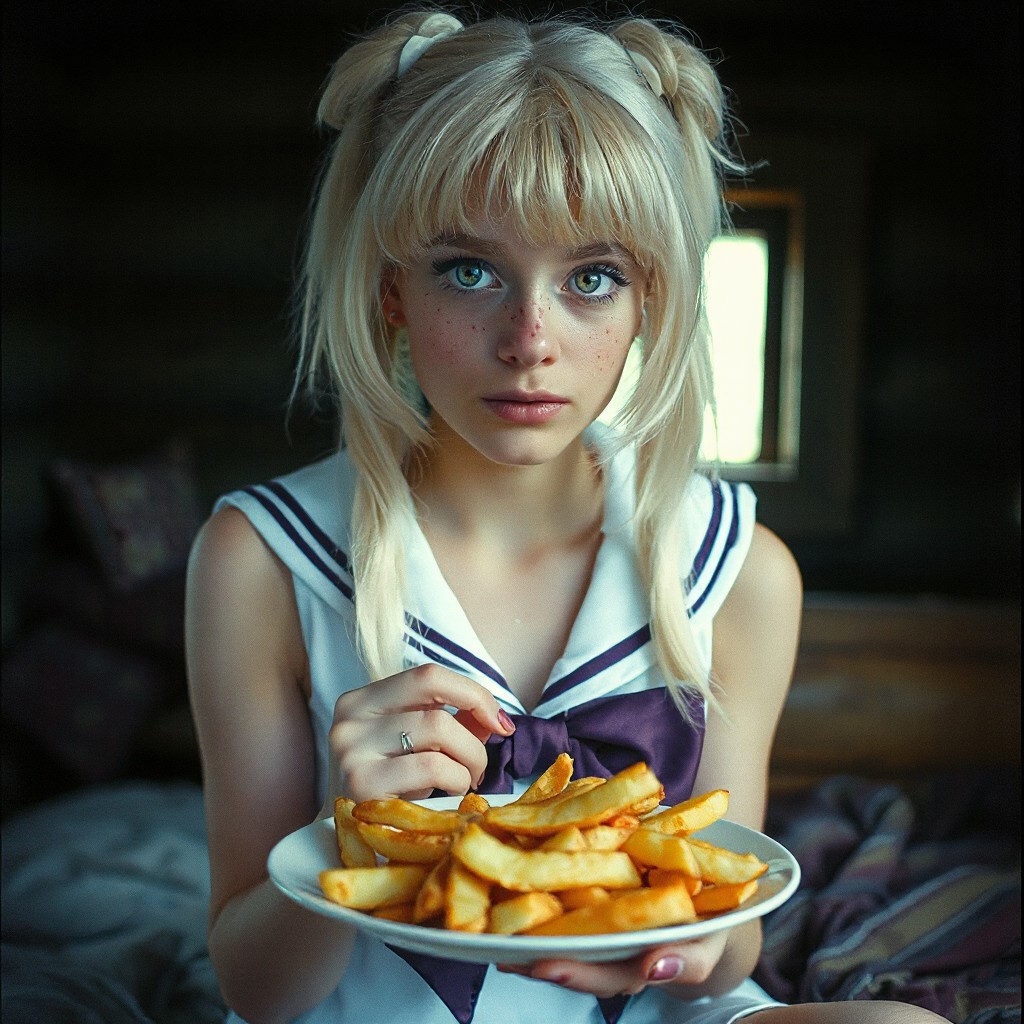 iphone 8 photo of Oksana Akinshina, silver blond hair, green eyes, cosplaying as sailor moon, in an old slavic cabin, grainy footage, lots of freckles, holding a plate of fish and chips. The atmosphere is cozy yet melancholic, with soft natural light filtering through a small window. The image has a textured, film-grain aesthetic, reminiscent of old analog photography, with muted colors and a slightly desaturated tone."