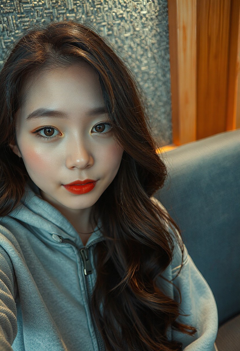 DLSR photograph, slender, beautiful 26 year old korean model . Pale skin, lighting<lora:MoriiMee_Gothic_Niji_Style_FLUX:0.3500000000000001> <lora:AsirAsianPhotographyflux:0.7000000000000002> "A close-up selfie of a young woman with long, dark brown wavy hair. She has fair skin, delicate facial features, and is wearing subtle eye makeup with a touch of pink blush on her cheeks and bold red lipstick. She is wearing a light gray zip-up hoodie. The background is slightly out of focus, showing a textured gray surface and a glimpse of vertical wooden panels in warm tones. The lighting is soft and even, highlighting her features. The overall mood is serene and slightly glamorous."