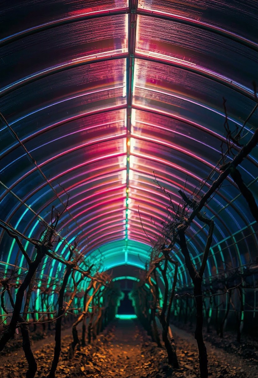 JNANX,luminous white silhouette,cyan glow,emerald highlights,flickering outline,dreamlike movement,rippling colors,drifting embers,infinite black background,psychedelic colors,ethereal,futuristic surrealism,gw,glowing,night,night sky,trippy, Capture the interior of a typical arched-roof greenhouse used for cultivating grapes, possibly Shine Muscat, in the Buyeo region of South Korea. The metal frame of the greenhouse creates a repeating pattern of lines converging in the distance. Bare, pruned grapevines are the main subject, their woody branches twisting and reaching along support wires. The ground beneath the vines is littered with dry leaves. Sunlight streams through the translucent roof, illuminating the scene with a cool, daytime light.