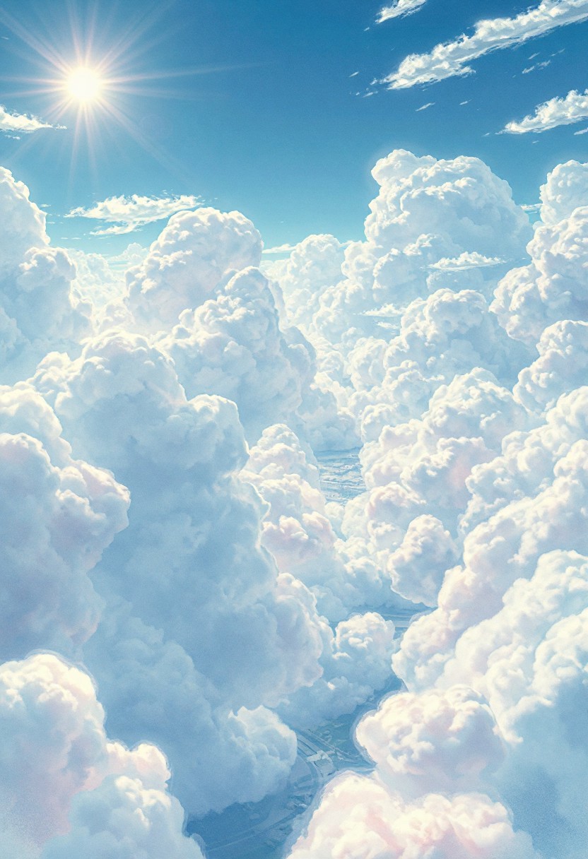 Vast anime-style sky with a massive textured cloud cover stretching across the entire scene, intricate structural cloud formations with detailed bumps and organic folds, scattered open gaps revealing patches of bright blue sky, cinematic view over a peaceful cityscape below, soft sunlight streaming through cloud breaks, pastel color palette (baby blue, soft white, light pink), highly detailed Ghibli-inspired artwork, hyper-realistic watercolor texture, dreamy and emotional atmosphere, 4K ultra-high resolution, sparkling sun in the upper-left corner with glittering rays shimmering through the clouds
