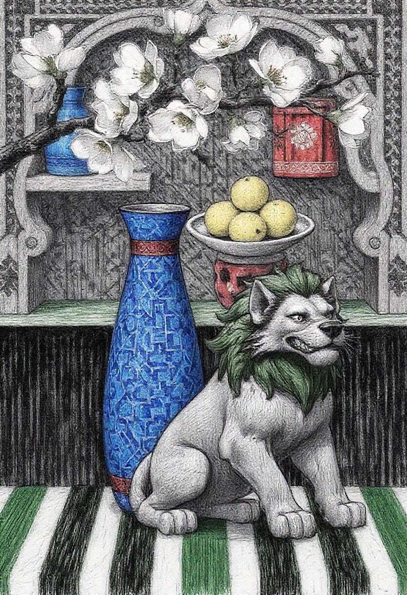 Pencil drawing, Generate a digital painting of a still life scene inspired by Korean folk art. The central focus should be a tall vase with a complex geometric pattern in blue and red, resting on a surface with green and black stripes. Next to the vase, show a seated mythical dog or lion-like creature with a grey coat, a colorful mane (red, green, and possibly other colors), and a fierce expression. Above and slightly behind the vase, present a shallow, round dish filled with three textured, pale yellow or white citrus fruits. A branch of a flowering tree, bearing light-colored blossoms, should enter the frame from the upper left. The background should consist of stylized shelves or architectural details with various patterns, including stripes, grids, and meanders, in a palette of blues, reds, greens, and black. The overall style should evoke the decorative and symbolic nature of Chaekgeori paintings.