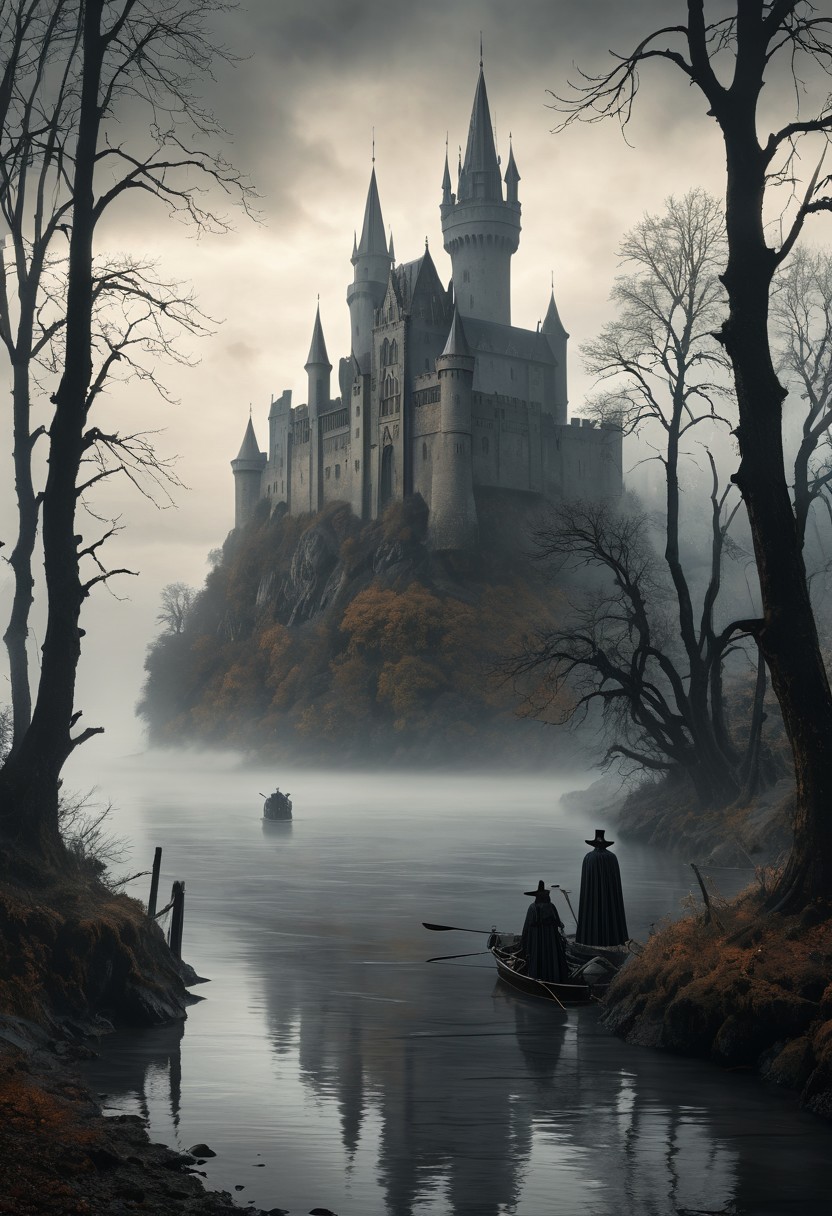 This haunting, gothic illustration depicts a mist-shrouded landscape dominated by towering, spired castles looming over a dark river. On the riverbank in the foreground, three mysterious figures in long cloaks and wide-brimmed hats stand in shadow, one of them beside a bicycle, all facing the eerie castle across the water. The skeletal trees and fog-drenched environment contribute to the ominous atmosphere, as light flickers from the windows of the distant fortress. The muted, monochromatic color palette of greys and sepia tones adds a timeless, ghostly quality to the scene, evoking themes of mystery, horror, and dark fantasy.