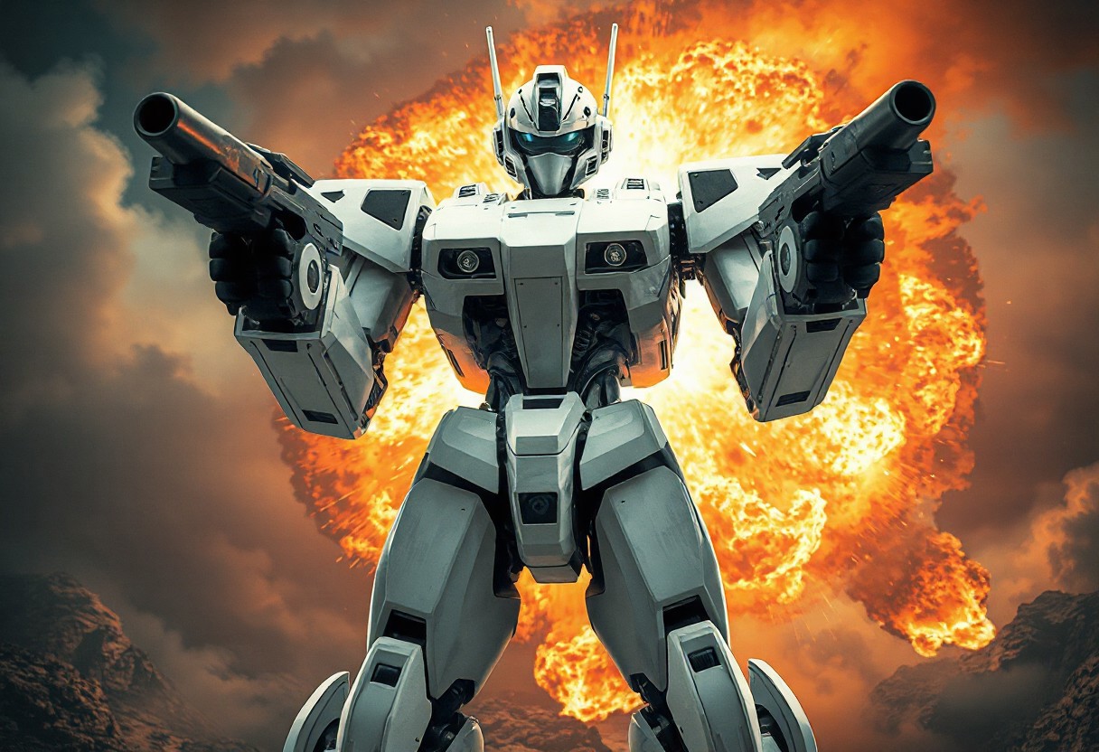 Observe an impressive depiction of aMachineKing Robot against a mystical eruption. This state-of-the-art machine boasts pristine whites contrasted elegantly with sharp blacks and grays, exuding sophistication through every line and curve. Its dominant posture conveys readiness as two guns attach securely onto each robotic limb - poised yet restrained power at hand. Enlarged cameras serve dual purposes; scanning surroundings whilst maintaining unwaveringly focused attention towards what lies ahead. An expansively powerful energy burst ignites behind our metalloid hero creating depth within this masterfully crafted piece where precision meets artistry effortlessly blending together into high quality visual harmony full of vibrant colors & striking details worthy enough even for prestigious platforms like ArtsStationTrendings