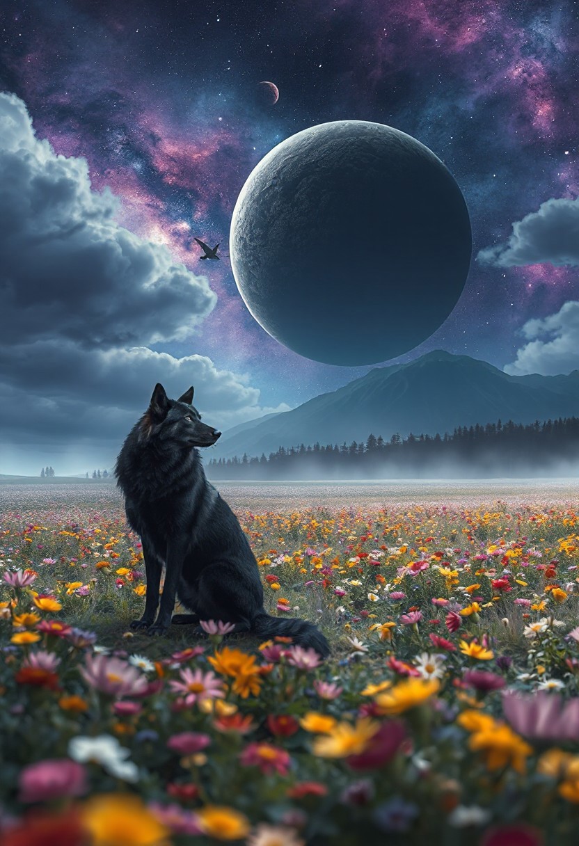 Positive Prompt: masterpiece, best quality, ultra-detailed, cinematic, ethereal atmosphere, fantasy landscape, lone black wolf sitting in a colorful field of wildflowers at night, vibrant but soft flower meadow, vast open landscape, dreamy lighting, soft mist, glowing dark planet in a deep indigo and purple cosmic sky, swirling nebula clouds, stars scattered across the sky, majestic distant mountain, dark pine forest on the horizon, magical and mysterious mood, highly detailed, vibrant yet muted color tones, wide angle view, soft fantasy style, gentle illumination. Negative Prompt: flamingo, bird, daytime, bright sunlight, cartoon, anime style, lowres, bad anatomy, blurry, overexposed, ugly, bad hands, bad paws, poor composition, extra limbs, low quality, grainy, saturated colors, text, watermark