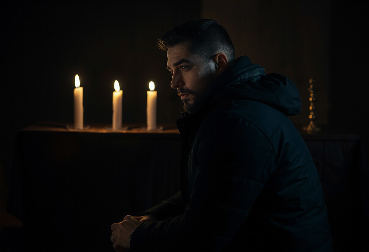 professional photo, side view photo of Caucasian man in kneeling in front of an altar with 3 lit candles on it, wearing a dark blue parka, serious face, contemplative expression, dark features, dramatic shadows, very dark and underexposed, face lit only by candles, all else dark
