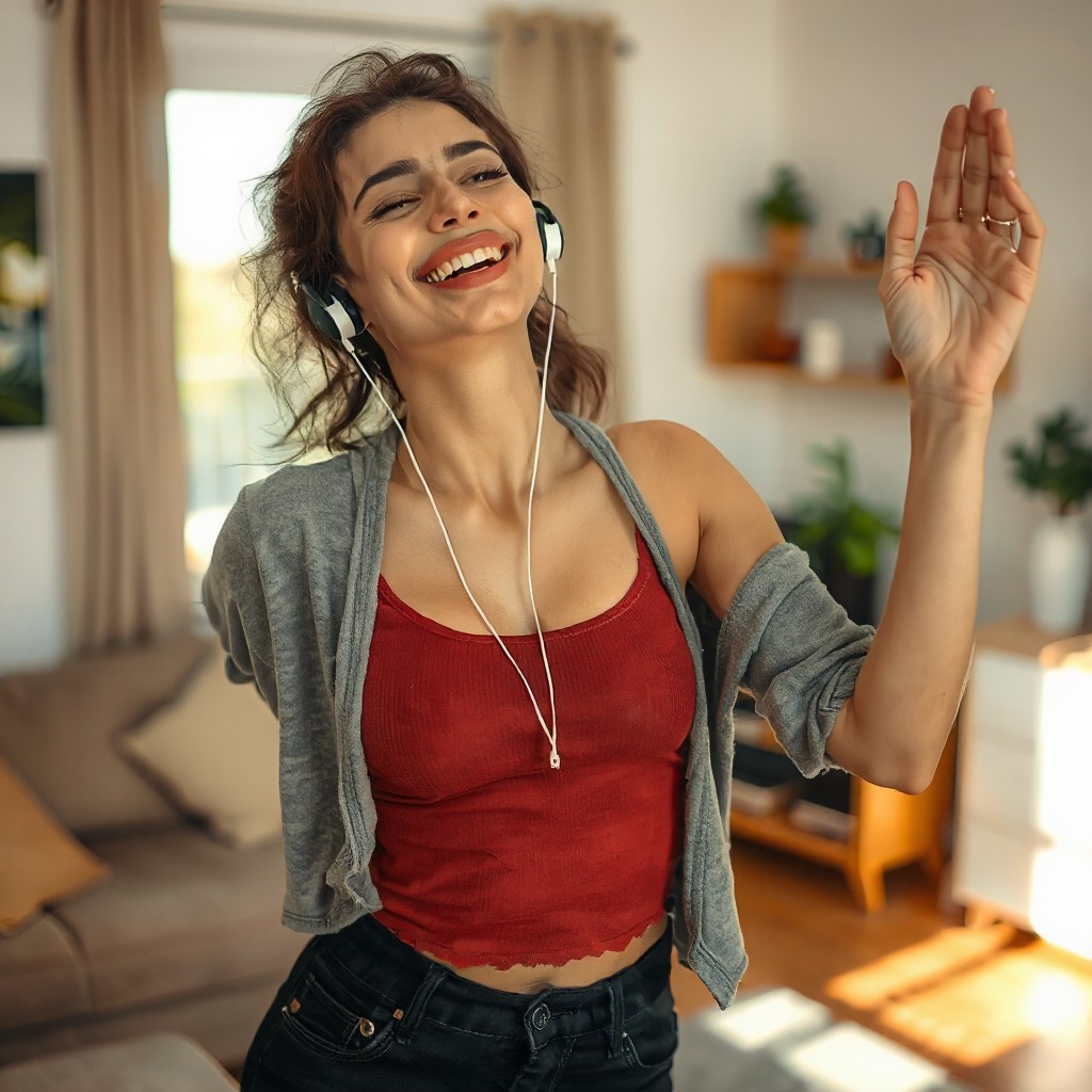 lovely woman, 25yo, sexy dancing solo to music on ear buds, hand in air, relaxed, excited, body twisted, head tilted, emmersed in joyful music, living room
