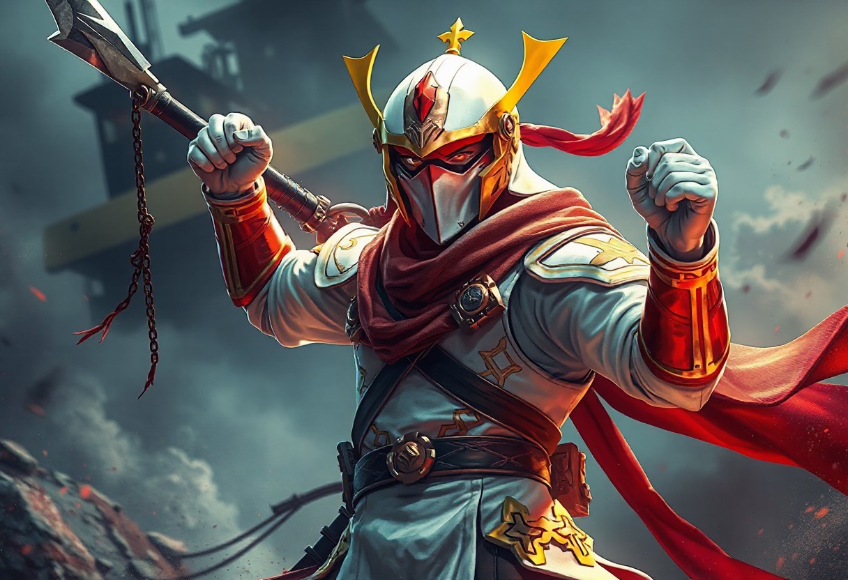 Depict an epic, full-body view of a Crimson Shadow Armor Ninja, adorned with pristine white armor accented in gold and red. The Ninja, holding a Kunai with Chain in one hand and raising the other in triumph, wears a yellow helmet with a red visor. Set against a Dark Tuner Doom Submarine background, the Ninja's dynamic pose and contrasting colors create a captivating visual. Enhance the image with sharp lines, brush strokes, stunning colors, and vivid emotions. Highlight the Ninja's intricate armor details, handcrafted with precision, and showcase harmonious, multi-colored lighting. Create a 4K or 8K artwork, capturing a well-timed moment of joyful impact and powerful message. Submit to CGSociety and Artstation for trending consideration.