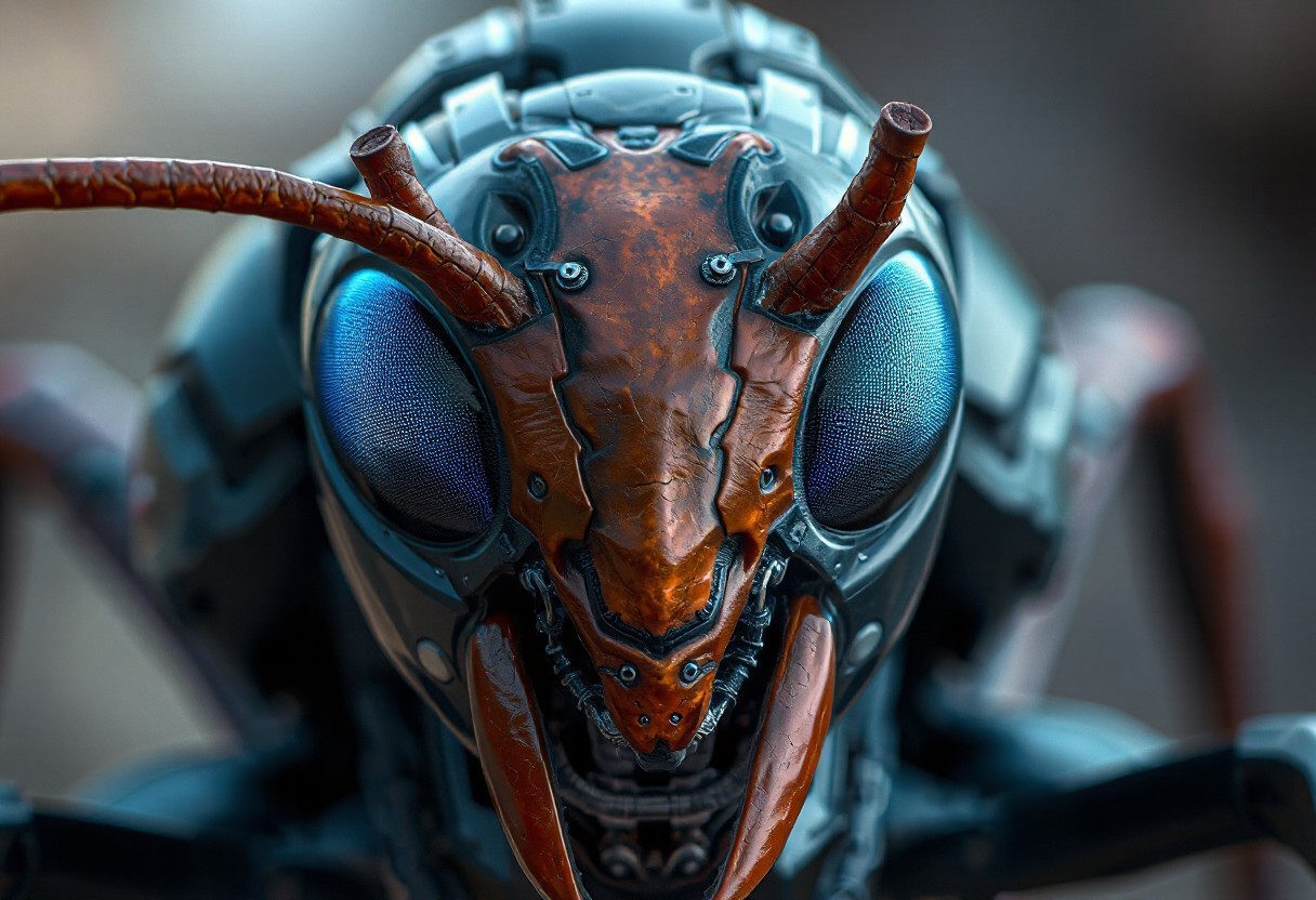 "High-res 4K depiction of a Cyber Raider with an ant's head, emphasizing vivid blue eyes and antennae. The ant's head is the central focus, with a dark blue Cyber Raider body in the foreground. The image boasts exceptional quality, lifelike details, sharp lines, harmonious colors, and a captivating matte painting. A dynamic action pose, vivid emotions, and a powerful message are showcased with the help of Octane Render and Unreal Engine 5. A trending masterpiece on Artstation and CGSociety, created in the style of Greg Rutkowski."