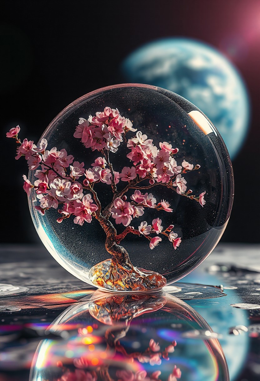 cherry blossom tree, completely transparent, reflective iridescent surface, glass art, colorful, translucent, Space, Lunar Surface, Cherry blossoms glow faintly, Earth in the background, Japanese art style, Japanese ink painting, best quality, sharp focus, high contrast, colorful, ultra quality, 8k, best quality,