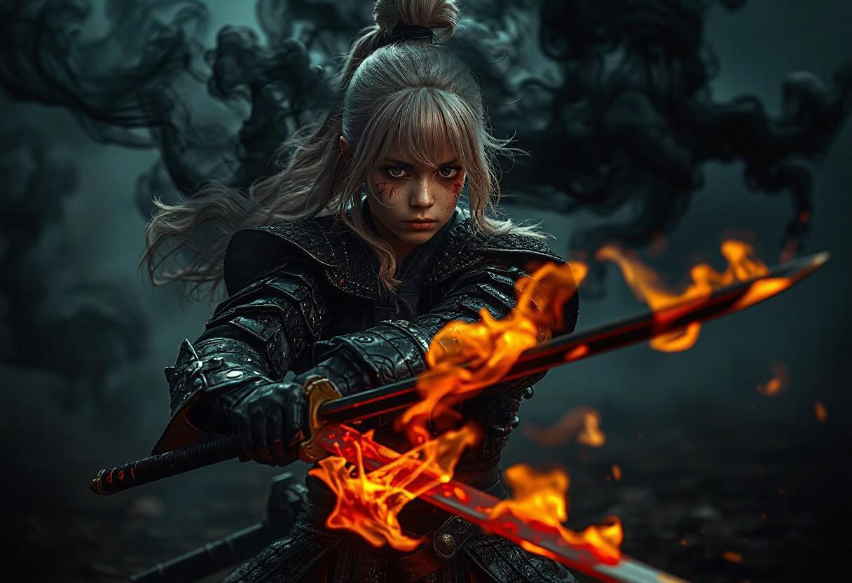 Ultra-realistic, cinematic shot of a young blonde female samurai in full battle stance, her body wreathed in swirling black smoke. She wears intricately detailed traditional armor fused with dark fantasy elements, gripping a cursed katana engulfed in blood-red flames. Her eyes emit black smoke, face marked by arcane curse sigils and splattered with fresh blood. The atmosphere is intense—mid-battle, with dynamic energy, as if she’s about to strike. The background is a war-torn battlefield, faintly illuminated by the eerie glow of her blade. Hyper-detailed textures, dramatic lighting (chiaroscuro), and a color palette of deep reds, blacks, and metallic accents. Style reminiscent of Ghost of Tsushima meets Dark Souls—mythic, savage, and visually stunning