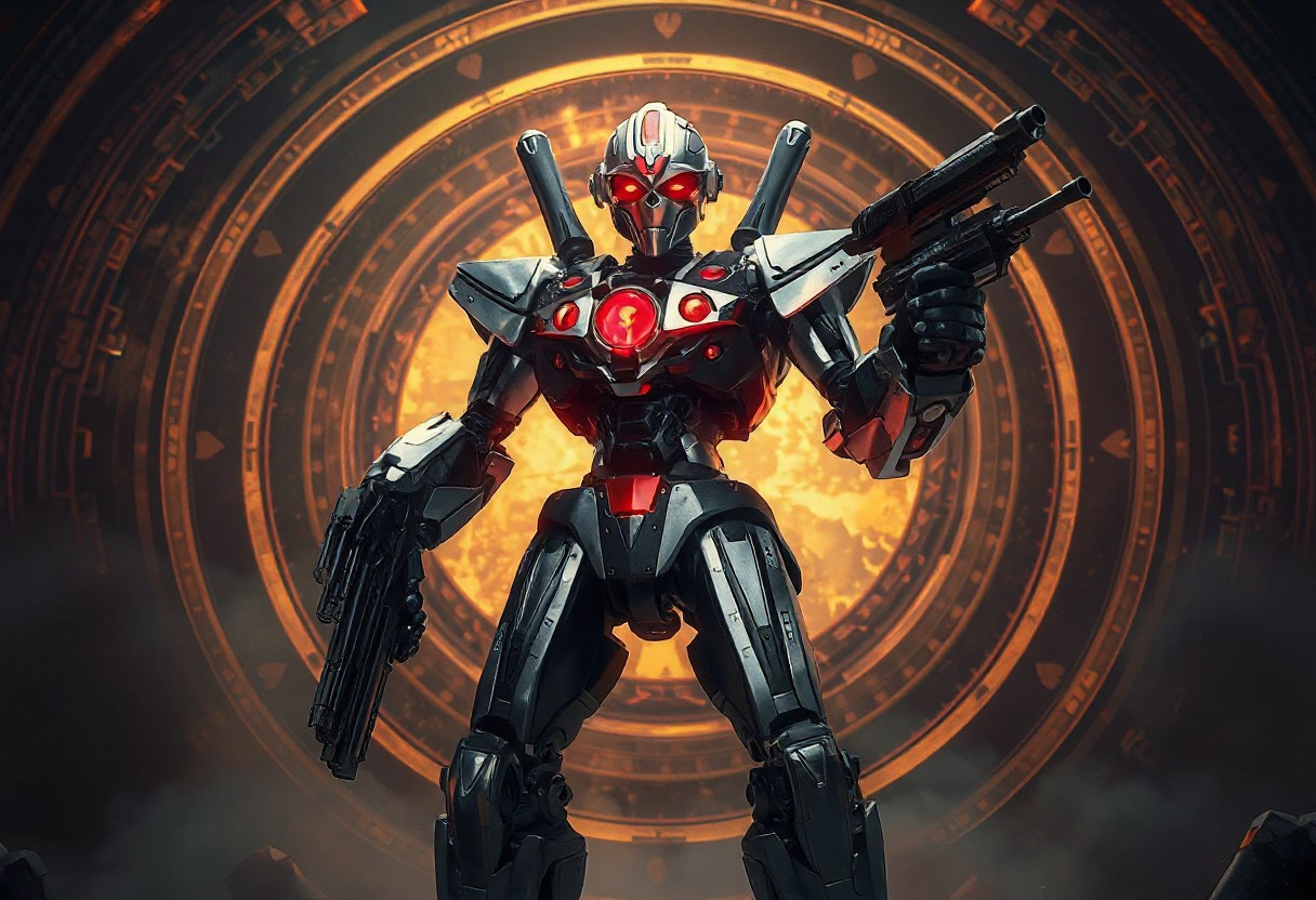 The Ultimate Timelord robot, a formidable pose predominantly in black, silver, and red, stands ready for action in a magician's circle against a detailed background. Equipped with guns, the robot's intricate details and sharp lines add to its lifelike appearance. The dynamic action pose and captivating lighting enhance the cinematic feel of the 4K image. The relative positions of the robot suggest unity, while vivid emotions and a powerful message are conveyed through the detailed eyes of the Timelord. This artwork, trending on ArtstationHQ, showcases exceptional quality, stunning colors, and harmonious composition, masterfully created with a grammer effect style and splash ink illustration using Octane Render and Unreal Engine 5.