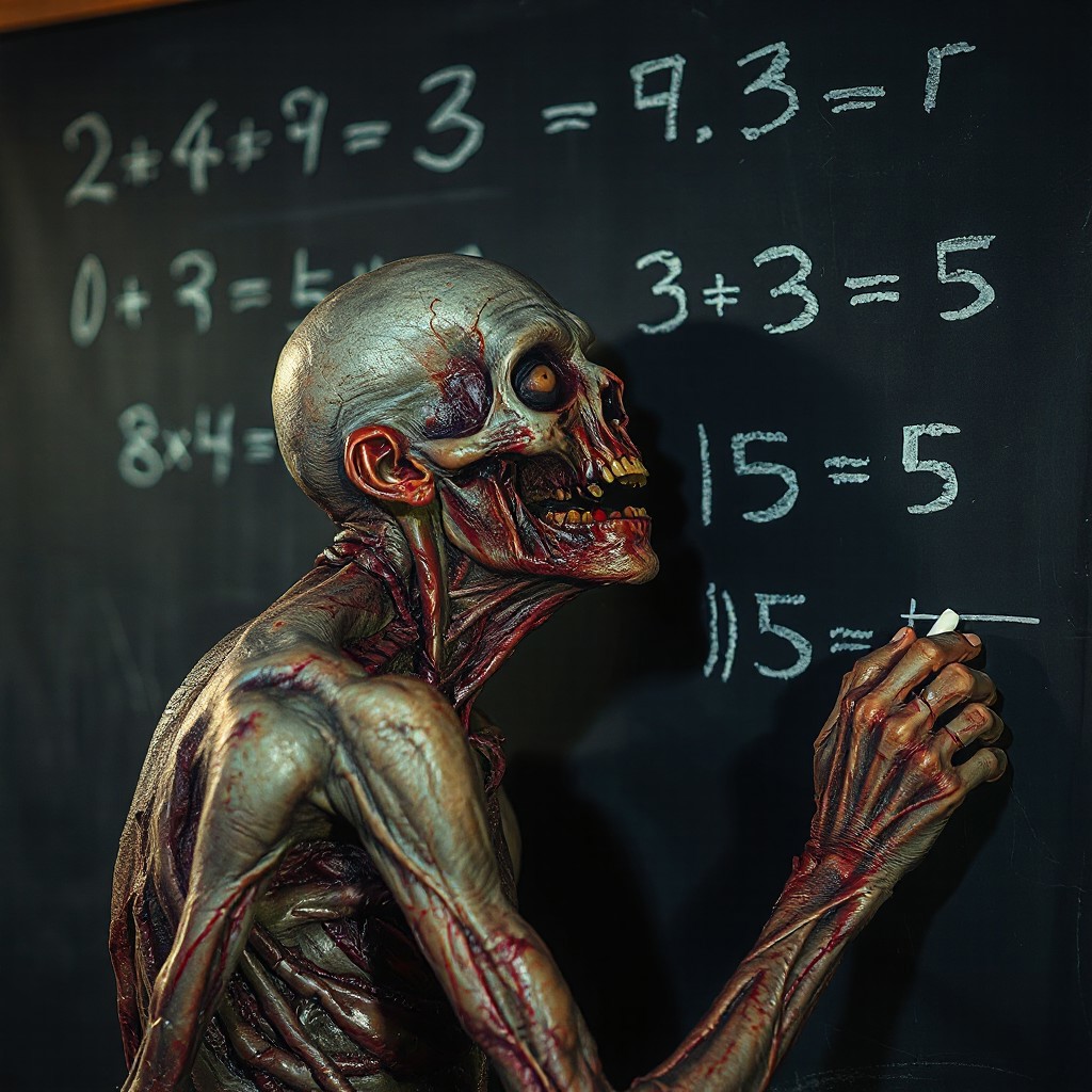 Photograph of a grotesque rotting zombie who is in the middle of chalking up a math problem on a blackboard, horror movie still, special effects, horror sfx, grindcore