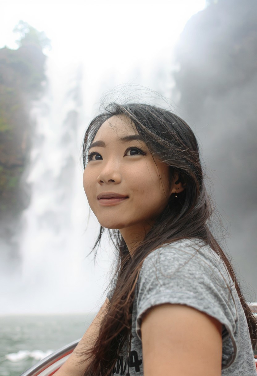 lovely Asian woman at Iguazu Falls, Argentina, in a boat near the base of the falls, looking up at waterfall coming down, mist covering everything, especially her face and hair hair. close up on face and falls.