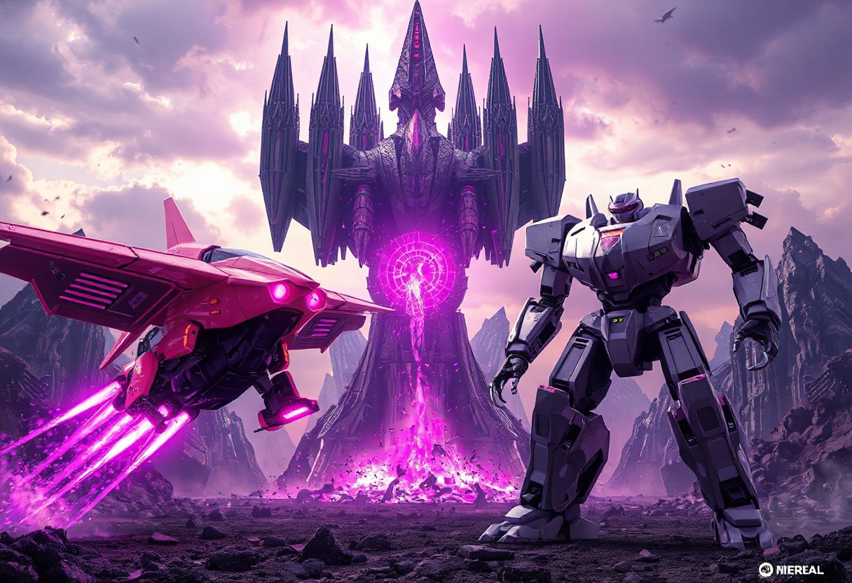 "Epic 3D render of two harmonized mechs poised for battle before the colossal Fandora, the Flying Fortress—a floating citadel of jagged obsidian spires, crackling violet energy cores, and levitating debris fields. Left: Flying Pegasus Railroad Stampede – A sleek jet-form mechanoid in electrified magenta and royal purple, its wings swept back with ion thrusters blazing neon-pink plasma trails. Carbon-fiber hull adorned with holographic racing stripes and retractable missile pods. Right: Super Defense Robot Lio – A towering humanoid guardian with matte-lavender armor, hydraulic limbs poised in a defensive stance, and a chest-mounted prismatic shield generator. Its visor glows with AI-targeting grids, while retractable tungsten claws extend from its fists. The duo flank a central energy vortex, their mirrored poses creating dynamic symmetry. Fandora looms with storm-wracked skies, its foundations crumbling as gravitational anomalies distort the battlefield. Dramatic Dutch angle shot using Unreal Engine 5 ray tracing, Octane Render hyper-textures, and Raphael-style chiaroscuro lighting. Metallic surfaces reflect aurora-like energy waves, while splash ink effects blend with Houdini particle storms for a retro-futuristic clash. 8K resolution, ArtStation-trending composition, golden ratio framing, dominated by cyber-magenta and void purple with chromatic combat accents."