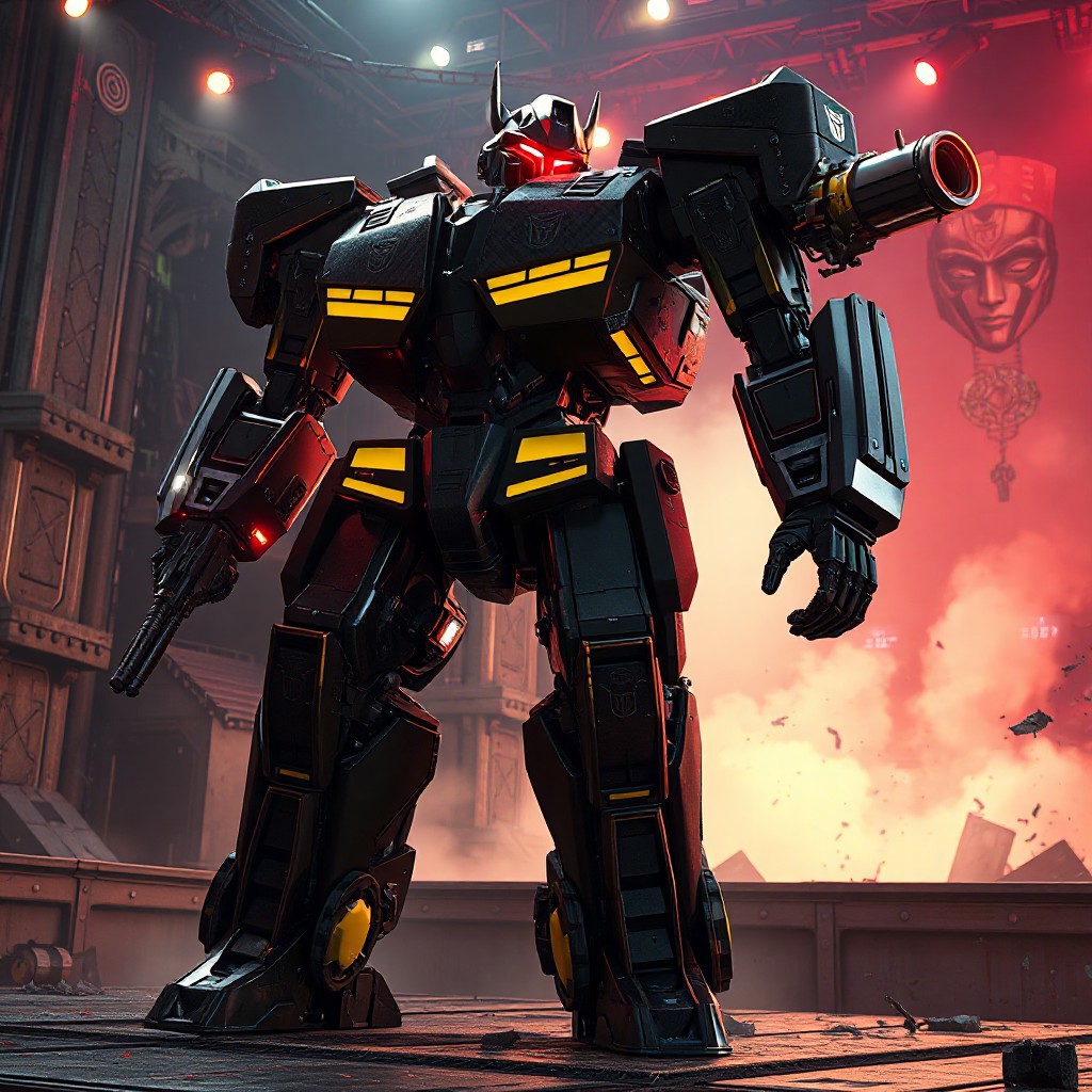 "Ultra-detailed 3D render of Transformers Machina Possesstorage, a towering mechanoid with jet-black carbon-fiber armor accented by neon-yellow hazard striping, standing in a combat-ready stance on a corroded steel stage within the Abyss Playhouse - Fantastic Theater. Its right arm mounts a glowing plasma cannon charging with crimson energy, while the left arm features a compact railgun with holographic targeting reticles. The robot's angular head glows with a scarlet visor piercing through hydraulic smoke, casting dramatic shadows across its industrial chassis. The theater backdrop features collapsing cyber-baroque architecture, floating holographic kabuki masks, and debris suspended in zero-gravity fields. Dramatic Dutch angle shot with Unreal Engine 5 ray tracing, Octane Render hyper-detailed textures, and Raphael-style chiaroscuro lighting. Metallic surfaces reflect neon spotlights and digital glitches, while splash ink weathering blends with Houdini particle simulations for a dieselpunk-meets-cyberpunk aesthetic. 8K resolution, ArtStation-trending composition, golden ratio framing, dominated by obsidian black, electric yellow, and emergency red with chromatic sci-fi aberrations."