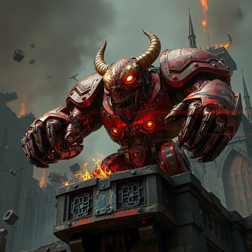 "Ultra-detailed 3D render of a Steel Ogre Grotto, a towering crimson-red mechanoid with gold filigree armor plating, featuring an oversized hammerhead skull glowing with molten circuitry and a compact, heavily-jointed body. Standing in a defensive stance atop a crumbling balcony of the Phantom Fortress Enterblathnir, its piston-driven fists crackle with energy. The fortress looms with gothic spires, floating debris, and holographic siege maps projected across corroded iron walls. Dramatic low-angle shot with Unreal Engine 5 realism, Octane Render textures, and Raphael-style chiaroscuro lighting. Metallic surfaces reflect ember-like sparks, while splash ink weathering effects blend with dieselpunk rivet detailing. 8K resolution, ArtStation-trending composition, golden ratio framing, dominated by vermillion and burnished gold with chromatic aberration flares."