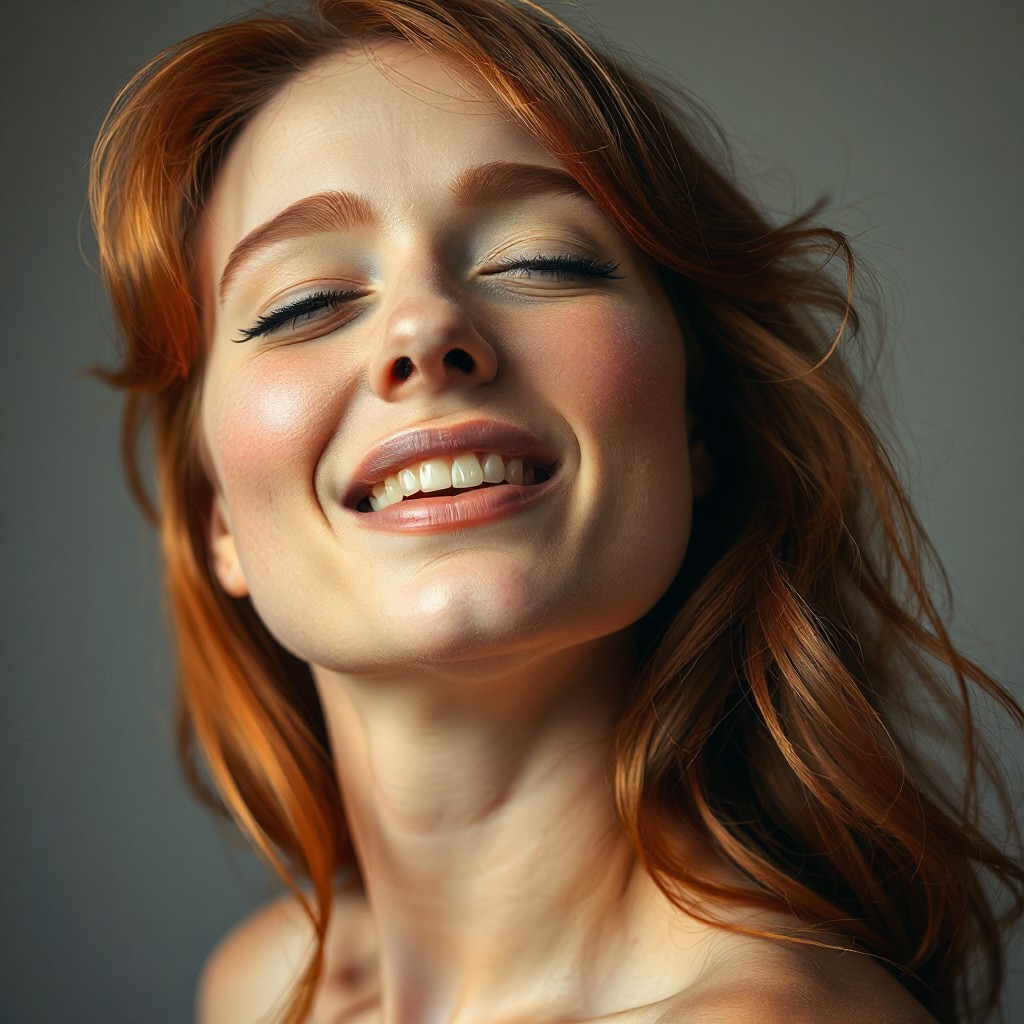 Beautiful redheaded woman with nostrils wide, face flushed, mouth slightly open, head tilted back a bit, eyes half closed, pleased, aroused, head shot