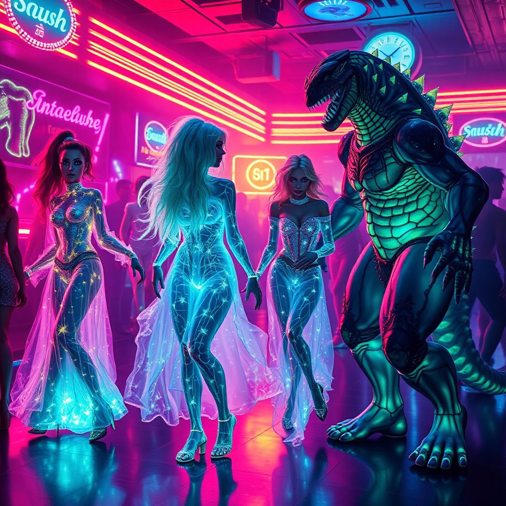 A vivid, cinematic strip club scene, illuminated by the pulsating neon lights that cast an ethereal glow on the bioluminescent patrons. In the center of this vibrant tableau, a stunning 32k masterpiece unfolds in a series of manga panels, each depicting a unique transformation sequence of five female Archaea and five male Kaiju. The females, with their translucent bodies revealing intricate bioluminescent veins, wear shimmering glass-like robes that seem to shatter and reassemble as they dance, each movement creating mesmerizing patterns of light. Their male counterparts, the protozoan Kaiju, stand tall and powerful, their bioluminescence glowing in stark contrast to their rugged, monstrous forms. The club is alive with the electric energy of 16k hyper-realistic, animated figures moving in the background, all sharing the same translucent, neon aesthetic.