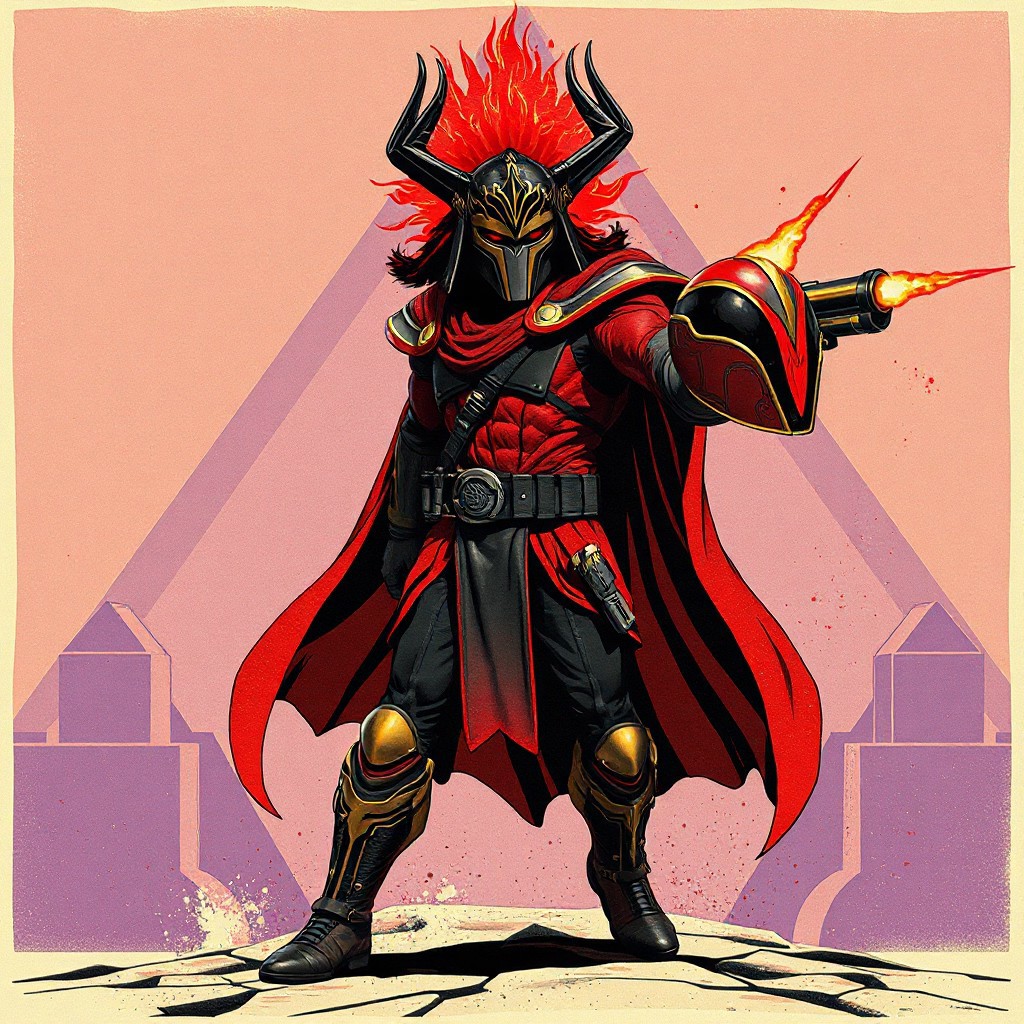 "A vintage Star Wars poster-style Horus the Black Flame Deity, anthro figure in dynamic action pose: blaster in right hand, red-black-gold helmet in left. Bold retro comic outlines, halftone textures, splatter effects, and stark Triamid Fortress geometric background. Color scheme: fiery red, matte black, gold accents, violet undertones. Stylized with Ralph McQuarrie-inspired concept art, retro-futuristic detailing, and dramatic shadows. Hyper-realistic textures, cinematic Unreal Engine 5 lighting, Octane Render gloss. Matte painting composition, trending on ArtStation, 8k HDR, golden ratio framing, isometric angle. Exaggerated proportions, vivid emotions, powerful stance. Retro-futuristic blend of 1970s sci-fi aesthetics and modern hyper-detailed CGI."