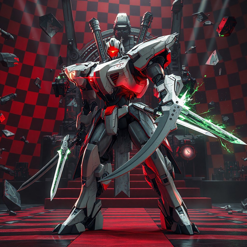 "A futuristic Superheavy Samurai Magnet robot in a dynamic battle stance, white-and-gray armored body with glossy metallic textures, dual katanas (large on right arm, smaller on left), and a crimson visor glowing with energy. Against a Nightmare Throne backdrop of red-black checkered patterns and floating geometric debris, evoking a surreal cyberpunk arena. Stylized with sharp mecha design, Octane Render gloss, and Unreal Engine 5 realism. Hyper-detailed surfaces: scratched armor, neon circuit lines, and plasma energy radiating from blades. Cinematic lighting—dramatic shadows and volumetric beams—accentuates the samurai’s poised stance and the throne’s ominous depth. Color palette: monochrome steel with red accents, juxtaposed against acidic green glows in the background. Influenced by Ghost in the Shell mecha aesthetics and Katsuhiro Otomo’s industrial art. Trending on ArtStation, 8K HDR, golden ratio framing, Dutch angle composition. Matte painting layers blend 3D CGI and traditional ink splatter effects for raw intensity.