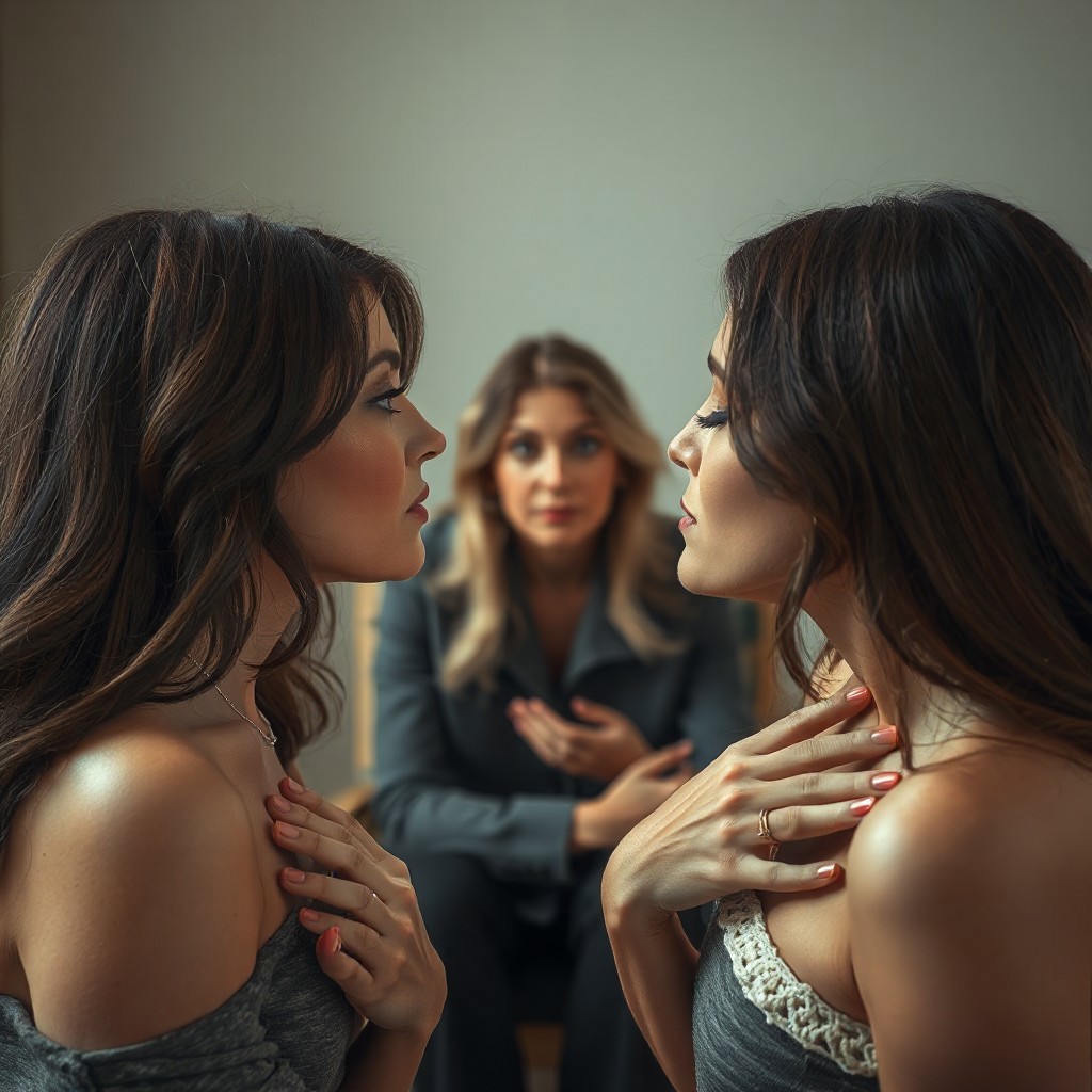 in background, beautiful woman 35yo, sitting on a chair, open eyes, staring at viewer, wearing severe clothing, (watching the faces of two lovely women) intently as the kneeling women in foreground kiss, hands on each other's breasts, close up on three faces