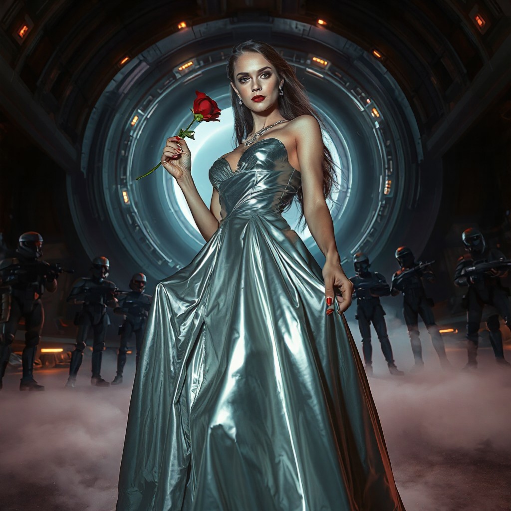 slender arrogant cold femme fatal russian princess wearing rich full skirt glossy silver foil gown, small size opulent glossy red high heels, jewels, holding red rose in her right hanfd, lifting her skirts with left hand, posing standing, view from below, evil grin, green eyes, lipstick, giant portal to outer space, fog from the floor, empire spaceship hangar, surrounded by halo odst troopers, TIE spaceships at the background, fashion look, hollywood, vogue makeup, porcelain skin, long haired, ultrathin waisym reminiscent of Lucas, Spielberg styles, with close-up glamour photography and dramatic lighting view from below,
