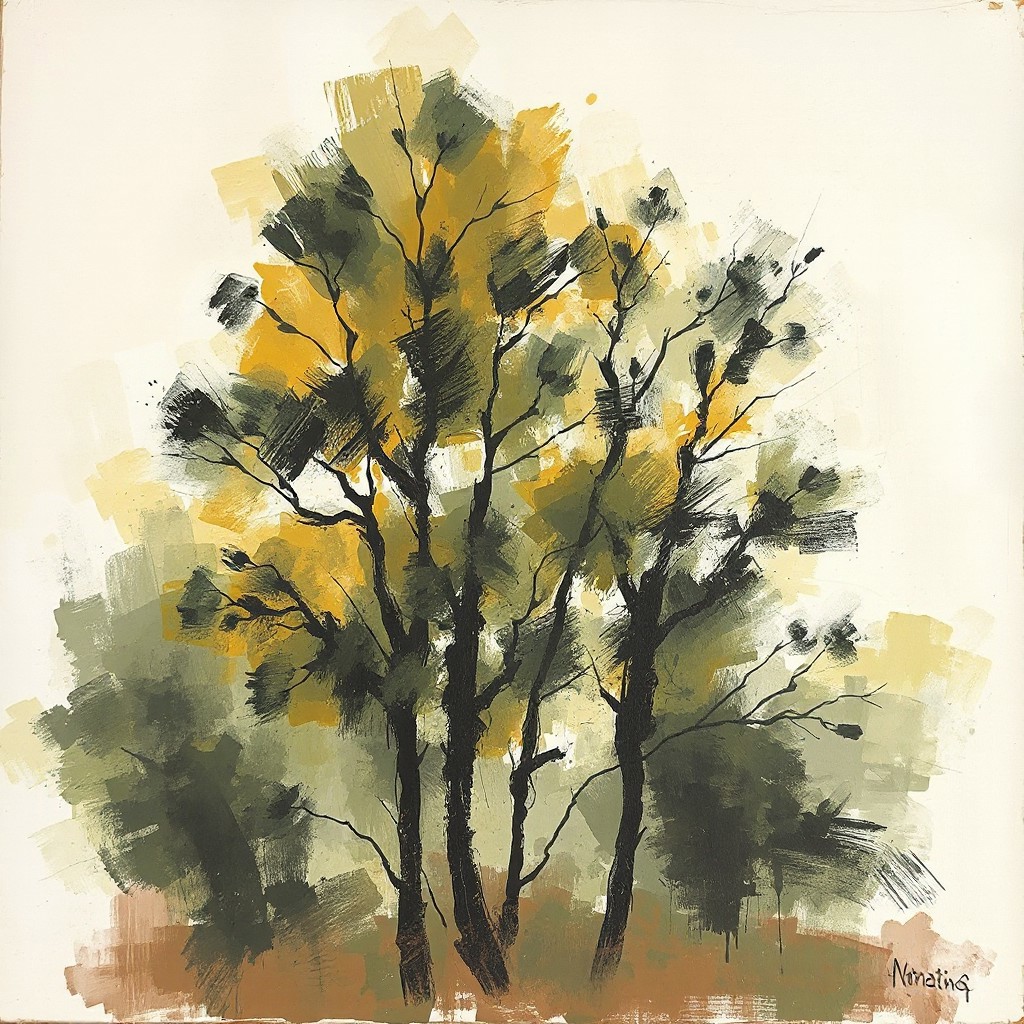 painting of trees, rendered with bold, expressive smudges and unfinished strokes