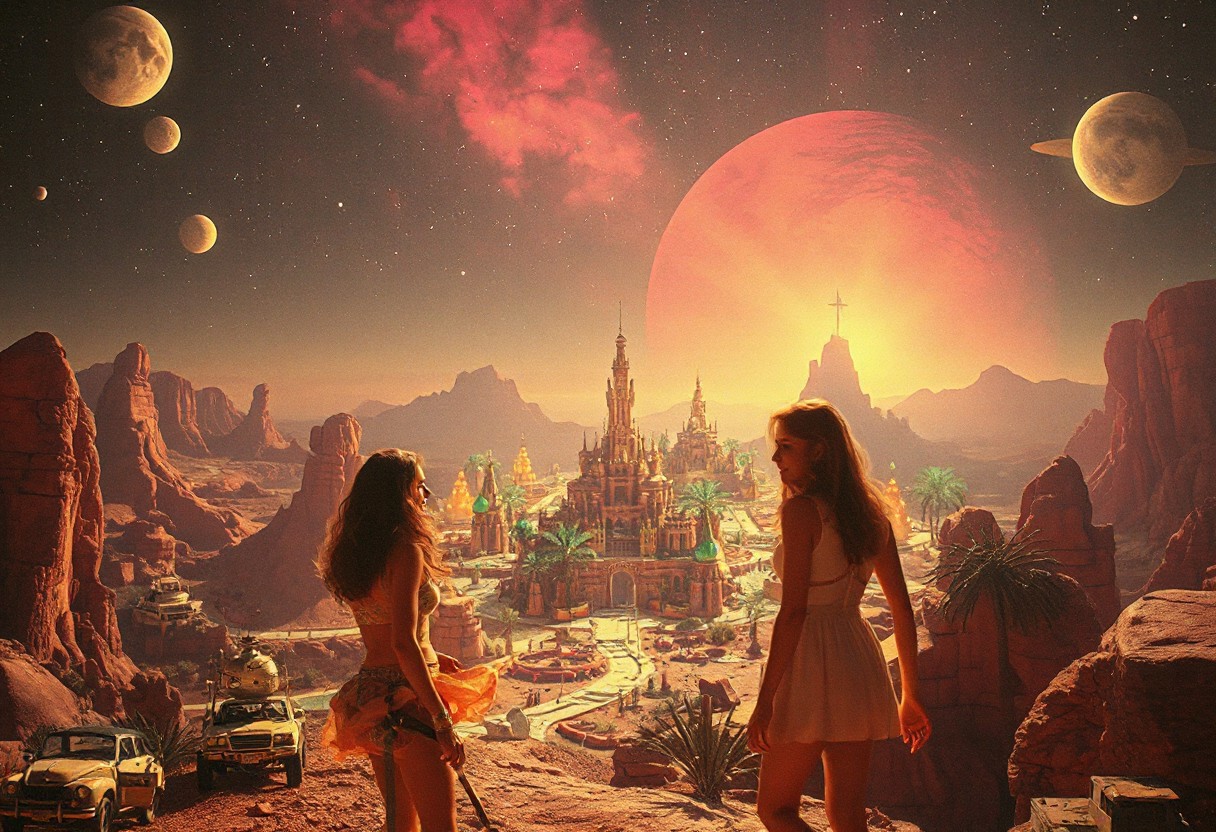 cinematic photograph, three women astro-explorers explore a mysterious psychedelic city of Fruitopia ,1960s adventure b-movie science fiction film, technicolor , in the style of John Berkey