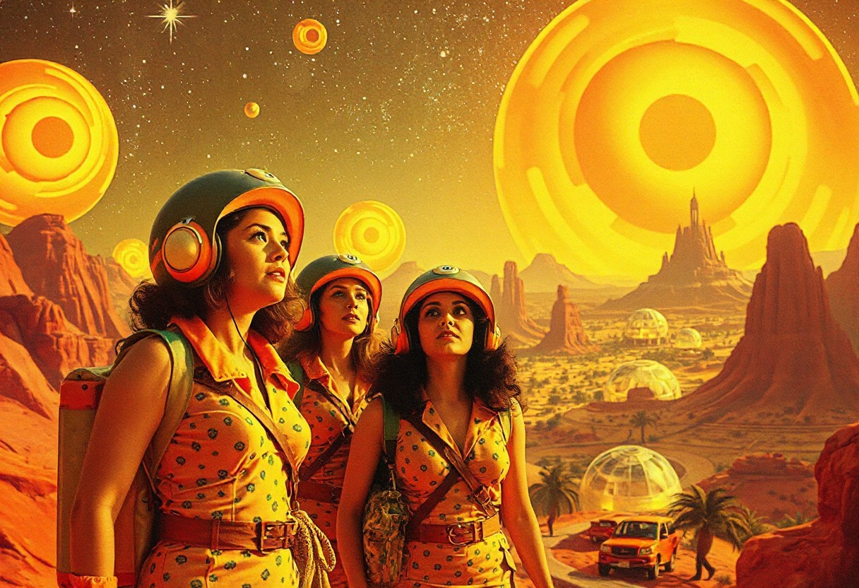cinematic photograph, three women astro-explorers explore a mysterious psychedelic city of Fruitopia ,1960s adventure b-movie science fiction film, technicolor , in the style of Ed Emshwiller