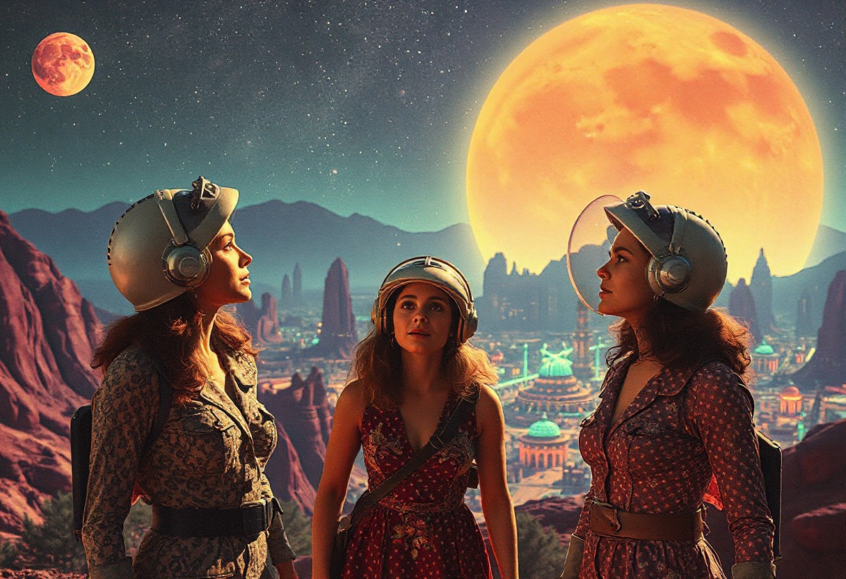 cinematic photograph, three women astro-explorers explore a mysterious psychedelic city of Fruitopia ,1960s adventure b-movie science fiction film, technicolor , in the style of Ed Emshwiller