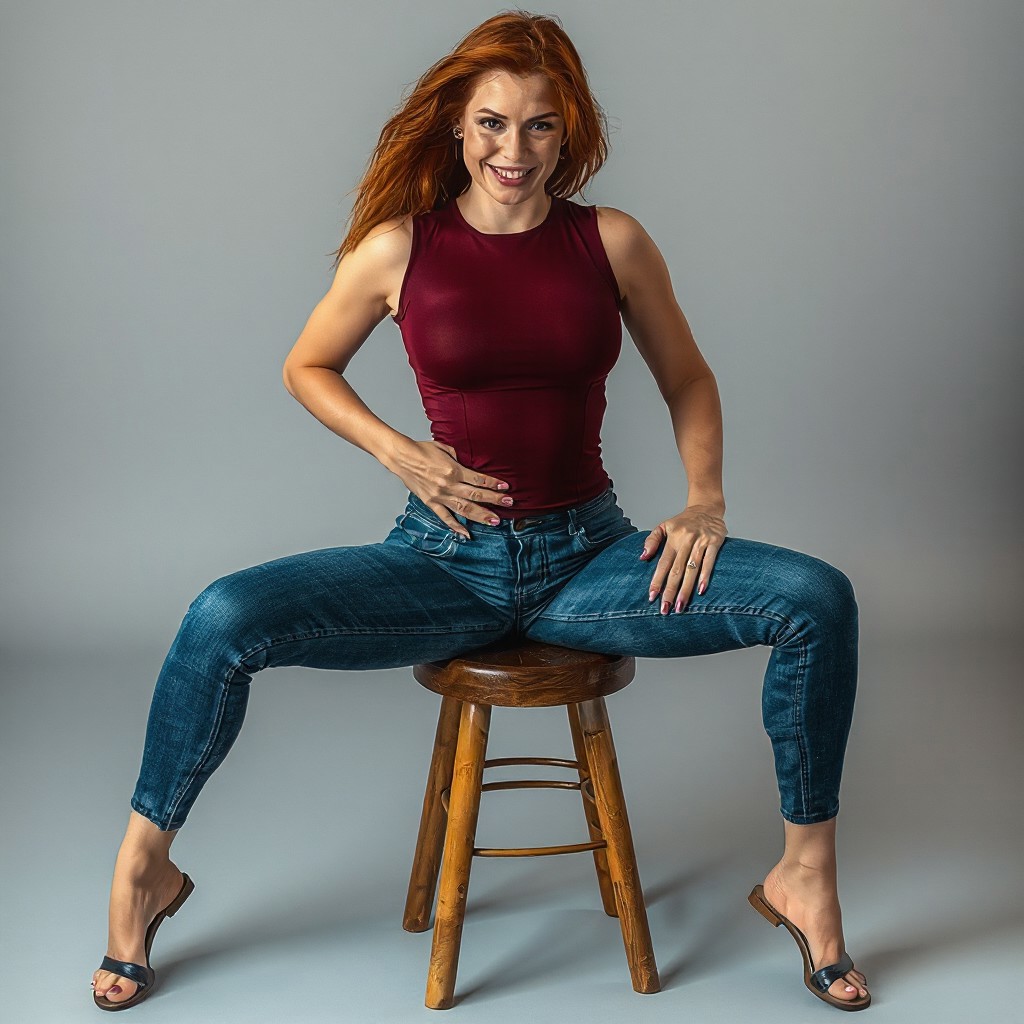 Tall attractive and athletic broad shouldered red haired woman with tight blue jeans, wearing very high cut dark red leotard underneath the jeans, sitting on stool, wearing sandals, toes pointing down, legs spread very very wide open, touching her hips and tugging on her leotard, smiling mischievously at viewer