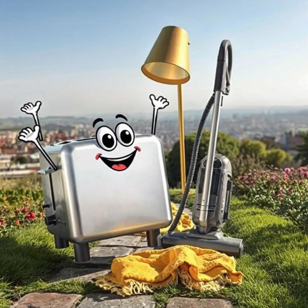 A silver toaster with cartoon eyes and a happy smile jumping in the air. A gold desk lamp next to the toaster. A grey vacuum cleaner next to the lamp. A yellow blanket in front of everything. All standing on a garden path with a city behind them. It is a sunny day.
