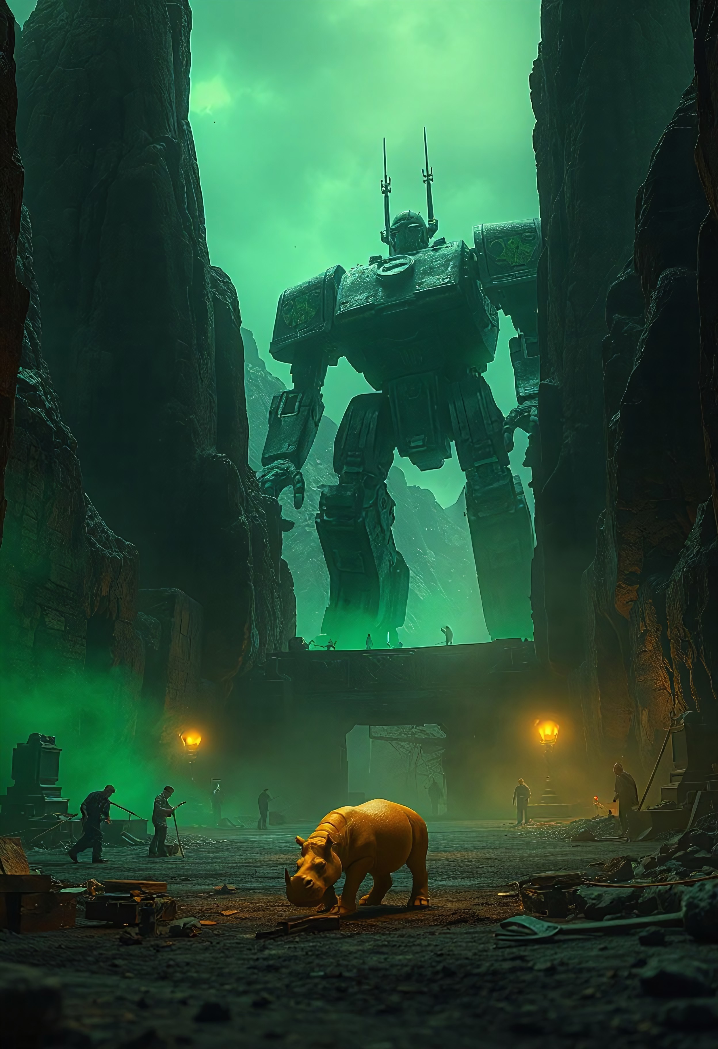 professional 32k rendering, green glow, action scene, green dark theme, shot in a ultra detailed warhammer castle, dwarfed by the surrounding mountains, soft warm lighting, tiny people working. silhouette of a detailed giant robot in the far distance, dusty, smoky, highly detailed, perfect timing, perfect quality, 16k, very detailed, highly detailed, realistic, photorealistic, scinematic, soft dramatic lighting, highly detailed, dramatic shadows, a tiny yellow hippo sculpture in the font on the ground,