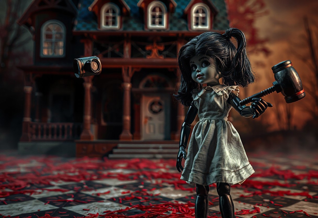 The grimdark image depicts Cursed Twin Dolls in a fascinating full-body pose, showcasing a blend of black and white colors against a vivid Cursed Dollhouse background. The dolls, positioned towards the right, exhibit unique features - the left doll has a large head with a camera, while the right doll has a smaller head with a doll hammer. Their black limbs contrast with their white bodies, and their dynamic poses add movement to the scene. The Cursed Dollhouse in the background offers depth and perspective. The image, presented in 4K and exceptional quality, highlights the lifelike details, sharp lines, and stunning colors, with a focus on the dolls' facial features and clothes. This captivating scene is rendered with Octane Render, using Raphael style, and is trending on Artstation.