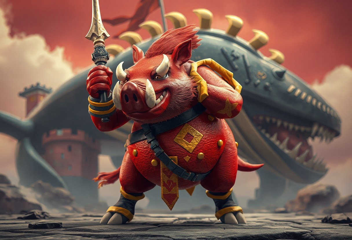 "Depict a formidable Boar Soldier in a vibrant red palette, poised for action against a Fortress Whale backdrop. The Boar Soldier's body is adorned with contrasting yellow and black accents, and it is positioned in the center of the image, with a turned head and a ready stance. should showcase exceptional quality, intricate details, harmonious colors, and a captivating lighting setup. Convey a powerful message, joyful impact, and beautiful detailed eyes, aiming for a well-timed moment, impeccable composition, and dynamic action pose. Intend for this artwork to trend on ArtStation and CGSociety, highlighting the artist's skill in handcrafted precision, sharp lines, brush strokes, and vivid emotions,4k."
