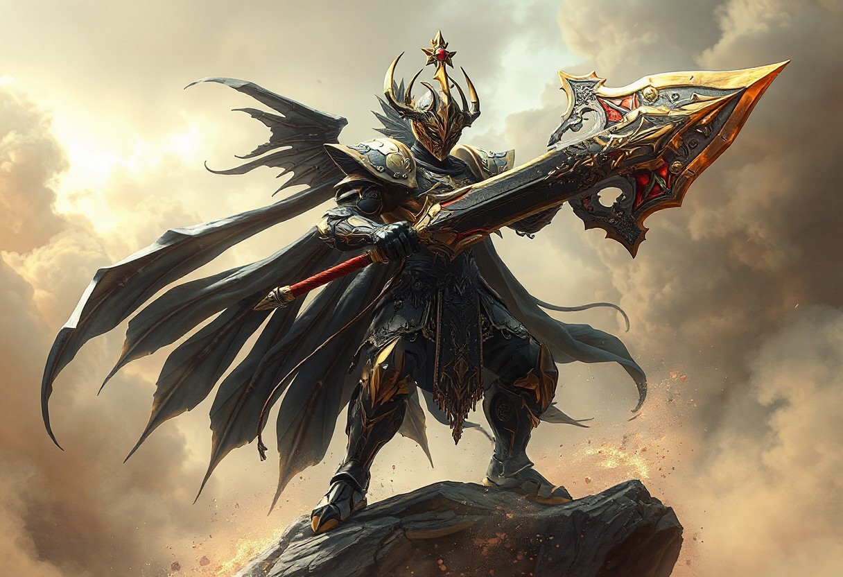 "Create a high-definition, 4K digital illustration of a Mechquipped Djinn Angeneral standing proudly on a Diamond-Dust Cyclone. The Angeneral, donning intricately detailed black and gold armor, wields a large sword and shield adorned with red and gold accents. The Angeneral's helmet, also black with a gold visor, exudes a sense of power and strength. The Diamond-Dust Cyclone serves as a dramatic and fitting backdrop, tying in the colors of the Angeneral's armor and weaponry. Utilize vivid emotions, dynamic action poses, captivating lighting, and a cinematic, hyperrealistic style to bring this epic character to life. Aim for a concept art piece that captures the attention of the CGSociety and Artstation communities."