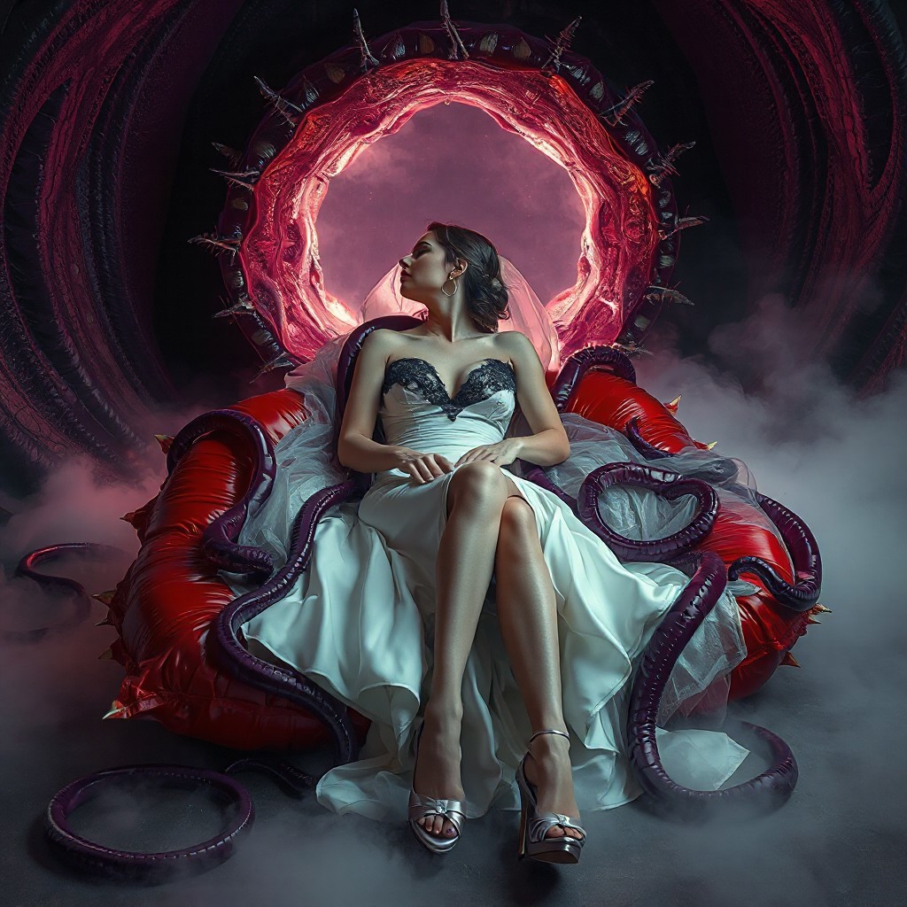 young bride in ivory honeymoon lingerie surrounded and kissed by two classy slender norvegian ladies in a whorish black lace camisoles and glossy high heels, entangled in long tentacles, laying reclined in weird red foil pillows, covered with giant ultrathin transparent slime veils, giant portal to outer space, fog from the floor, giant purple alien carnivorous flower with glossy spiked petals at background, weird alien hive slime walls and fleshy floor, horror, reminiscent of H.R. Giger, Zdzisław Beksinski, and Ash Thorp's dark, sleek styles, with close-up glamour photography, glossy satin and silver heels glistening, fleshy slime dripping, and dark shadows.