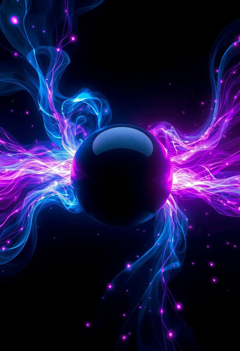 Visualize a dynamic energy field surrounding a central black sphere using vibrant blue and magenta hues. The energy is depicted as swirling currents, ribbons, and trails of light that flow around the sphere in complex patterns. Add small, glowing dots or particles throughout the scene to represent subatomic activity or energy fluctuations. The background should be completely black, creating a high-contrast effect that emphasizes the luminous elements. Style: Abstract, energetic, futuristic - inspired by scientific visualizations of plasma physics or magnetic fields. Render with realistic lighting and shadows to create a sense of depth and dimensionality. Aim for a visually striking image that conveys both beauty and power.