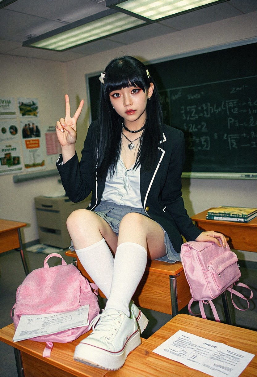 Photo-realistic, grungy analog-style photo of a beautiful emo with a small, slightly muscled hourglass figure, black goth long hair, with bangs, She’s wearing a kawaii school uniform, a blazer, white academia blouse, pleated skirt, thigh-high socks, platform sneakers, a heart-shaped choker, a egirl typical striking makeup, and hair clips. She has heavy blush makeup and a chain necklace. She is sitting on a desk, legs spread open in a fashionable manner. She is throwing a peace sign with one hand while the other hand rests on the desk she is sitting on. A pink girl furry backpack is also laying on the desk she is sitting on. The setting is a cluttered classroom with academic posters, scattered papers and scattered books on the desks, classroom florescent lights, and writing math equations on the chalkboard in the background. The photo looks raw and unedited, with visible film grain and harsh lighting from the flash. Her eyes are very pale blue, almost grey. Cool lighting. Analog style. It is a candid style photo.