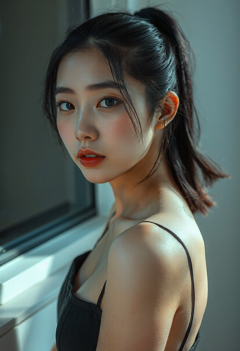 DSLR-style, slender, elegant 26-year-old Korean model, translucent pale skin with natural texture, soft shadow on cheek, diffused daylight from side, parted lips, clean background, solo, masterpiece, ultra high-res <lora:NOOB_vp1_detailer_by_volnovik_v1:1> barely visible pores, subtle skin texture variation, translucent skin tone masterpiece, best quality, highly detailed, score_9, score_8_up, score_7_up, score_6_up, score_5_up, score_4_up, Expressiveh BREAK, solo, vietnamese, ((asian)), 18 year old girl, cute face, (blue eyes:0.5), (bold eyeliner:0.5), , flawless skin,, (fit body), (wide waist), perfect ass, (black hair), , medium breasts, perky breasts, perfect breasts, , perfect face, medium length hair, BREAK indoors, black dress, underboob cutout, pencil skirt, high ponytail, camisole dress, window, window fog,windowsill, spaghetti straps