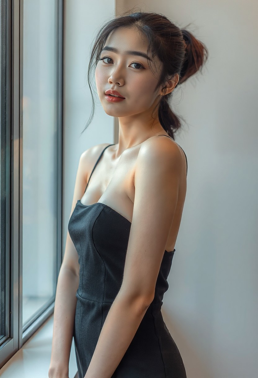 DSLR-style, slender, elegant 26-year-old Korean model, translucent pale skin with natural texture, soft shadow on cheek, diffused daylight from side, parted lips, clean background, solo, masterpiece, ultra high-res <lora:NOOB_vp1_detailer_by_volnovik_v1:1> barely visible pores, subtle skin texture variation, translucent skin tone masterpiece, best quality, highly detailed, score_9, score_8_up, score_7_up, score_6_up, score_5_up, score_4_up, Expressiveh BREAK, solo, vietnamese, ((asian)), 18 year old girl, cute face, (blue eyes:0.5), (bold eyeliner:0.5), , flawless skin,, (fit body), (wide waist), perfect ass, (black hair), , medium breasts, perky breasts, perfect breasts, , perfect face, medium length hair, BREAK indoors, black dress, underboob cutout, pencil skirt, high ponytail, camisole dress, window, window fog,windowsill, spaghetti straps