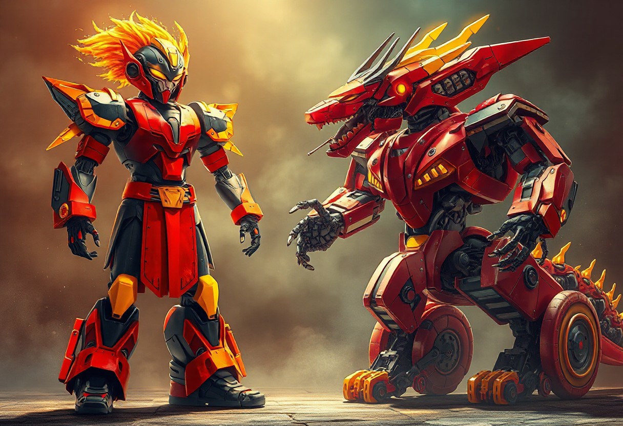 The artwork vividly depicts an epic scene of two distinct robots: a Cyber Magician and a Proto-Cyber Dragon. The Cyber Magician, standing proudly with a red and black body and a vibrant yellow head, is adorned with orange arms and legs that add a burst of color. On the right, the Proto-Cyber Dragon, transformed from a cyborg, showcases a red and black exterior with a yellow roof that matches the Cyber Magician's head. Its orange wheels echo the robot's arms and legs, creating a harmonious color contrast. The captivating 4K illustration boasts lifelike details, intricate facial and clothing features, and vibrant hues. With stunning colors, impeccable composition, and epic cinematic lighting, the image is a masterpiece in contemporary aesthetics.