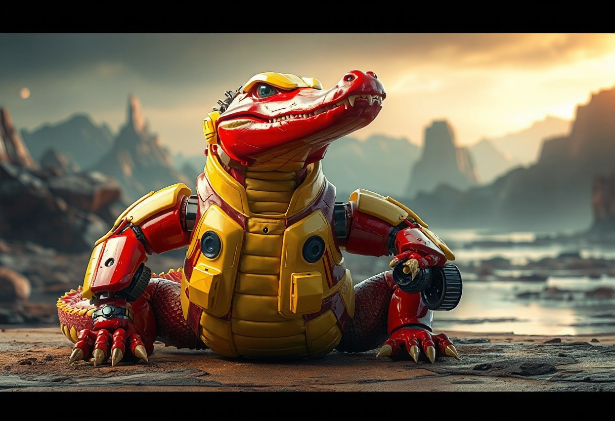Create a high-resolution, 4K matte painting of a Cyber-Tech Alligator at rest, with a dynamic action pose, against a backdrop of a cybernetic hidden technology landscape. The alligator, predominantly red and yellow, has a red head with a yellow visor, and a body adorned with yellow accents. Its arms, also red, end in yellow hands equipped with black wheels. Despite the complexity of its components, the alligator appears to be in a state of rest, awaiting its next adventure. Utilize vivid colors, sharp lines, and brush strokes, intricate details, and cinematic lighting to emphasize the alligator's lifelike details, detailed face, eyes, and clothes. Handcraft with precision, aiming for exceptional quality, harmonious colors, and a captivating focus. Intend for this artwork to be trending on ArtStationHQ, and optimize for CGSociety and a golden ratio composition. Use Octane Render and Unreal Engine 5 for realistic textures, and Raphael and Houdini styles for aesthetics. The final piece should convey a powerful message with joyful impact.