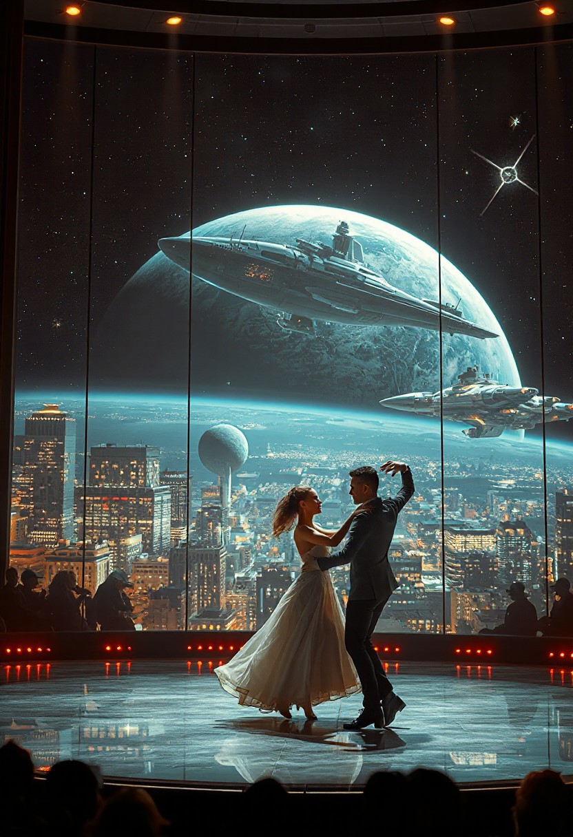 immaculately detailed realistic ultra quality image of a beautiful elegant female dancer and male counterpart are dancing on a futuristic stage micro-LED lighted, the dancer is the focus of the image, every detail of her dress and body are fully visible, the height of the image, behind the dancer on the stage is an enormous seamless and futuristic wall to wall and floor to ceiling window that looks out at a the planet's surface covered with the lights of enormous buildings and cities, An enormous deco starship with futuristic lighting and an enormous space station are visible in the background among the stars, Artistic art deco, dynamic perspective, (((overall architectural aesthetic is Art Deco Cyberpunk))). Epic image that elicits a feeling of romanticism, wonder, and awe, the silhouette of the audience can be seen in the foreground that show the enormous scale of the stage and seamless window behind it,