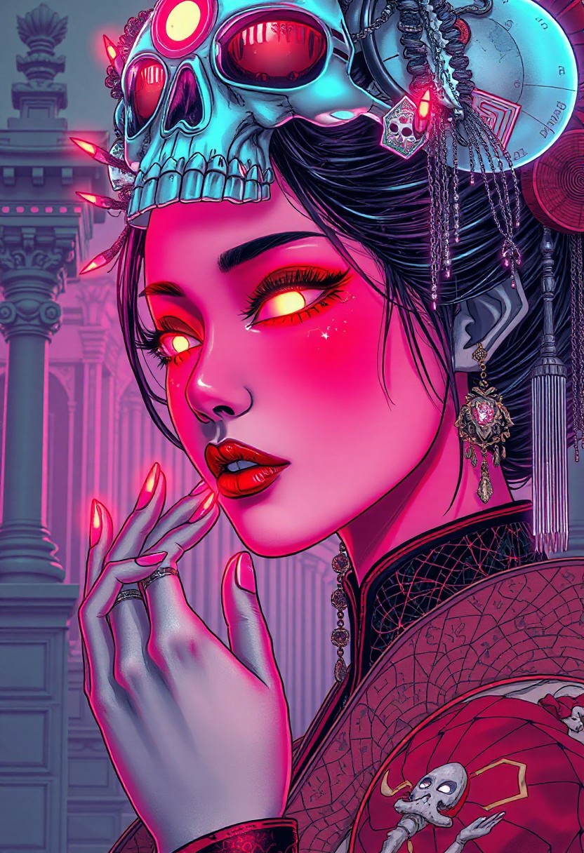 A highly detailed, intricate line-art illustration in the style of Steve McDonald. Detailed hyper realism in the visible body parts (face, hands, legs). 3D rendering, face close-up, CG high model, Elegant [goth geisha] with neon glowing makeup and a holographic skull headdress, in a [red and gold] cyberpunk aesthetic, dark fantasy, anime-style, illuminated by soft neon lighting , acrylic painting in style Adam Hughes. The composition features mesmerizing line work, fine architectural detailing in the background, and a play of light and shadow through intricate hatching. The overall aesthetic is serene, introspective, and dreamlike, blending realism with a highly structured, almost meditative pattern-based design.