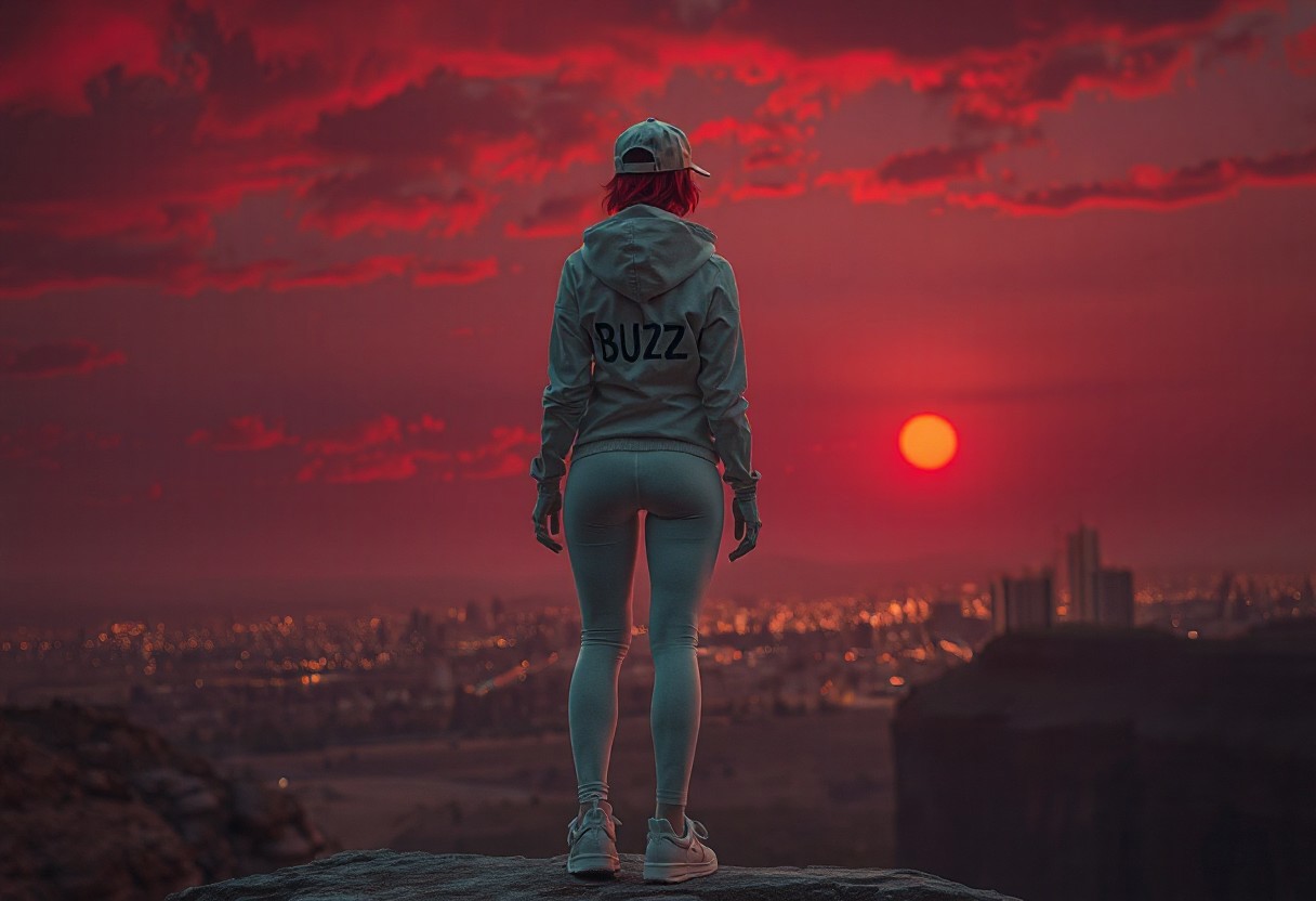 golden rule, perfect quality, 16k, very detailed, highly detailed, realistic, photorealistic, ultra sharp, scineastic, , colorfull, in a desert, warm red early morning, hot, detailed soft glowing clouds. dim red sun, city lights and high buildings in the far background, dark shadows, strong shadows, dramatic lighting, dark theme, dark, rimlight, highly detailed, close backshot, low angle, woman, slim, adletic, slender, standing on a cliff, writing "BUZZ" on jacket, back to the camera, short red glowing hair, thight white jacket, white cap, tight white leggings, white sneakers, white tight gloves, slim body, tight ass, tight legs,