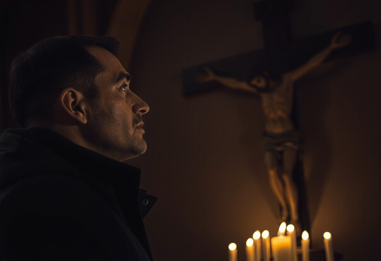 professional photo, side view photo of Caucasian man wearing a dark blue parka with dark features and a serious contemplative expression looking up at a plaster statue of Jesus on the cross mounted on the wall of a church, the man and Jesus are shown in profile, the scene is very dark and underexposed with only the man's and Jesus' face lit by warm, dim candle light, everything else is dark shadows