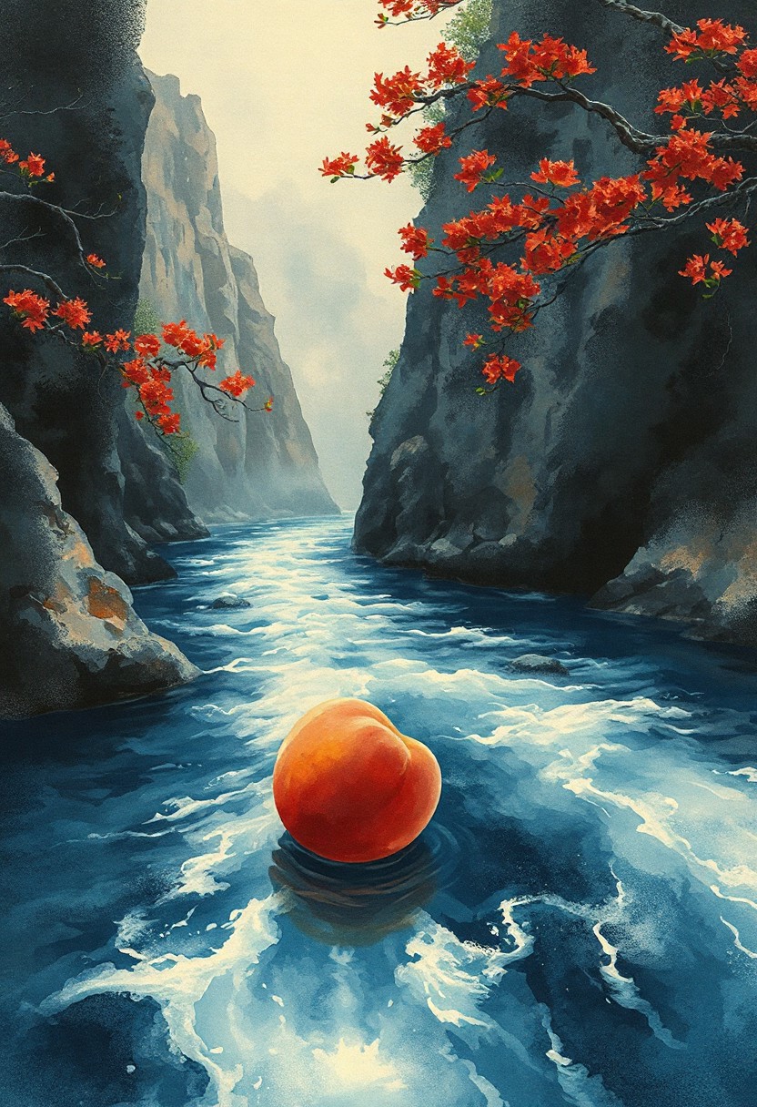 The peach flows backwards down a great river and floats on its surface. Japanese art style, Japanese ink painting, best quality, sharp focus, high contrast, colorful, ultra quality, 8k, best quality,