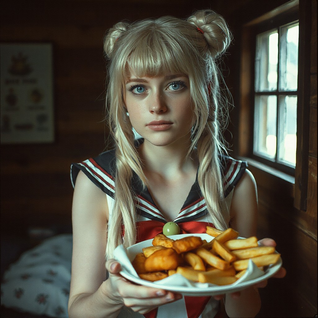 iphone 8 photo of Oksana Akinshina, silver blond hair, green eyes, cosplaying as sailor moon, in an old slavic cabin, grainy footage, lots of freckles, holding a plate of fish and chips. The atmosphere is cozy yet melancholic, with soft natural light filtering through a small window. The image has a textured, film-grain aesthetic, reminiscent of old analog photography, with muted colors and a slightly desaturated tone."